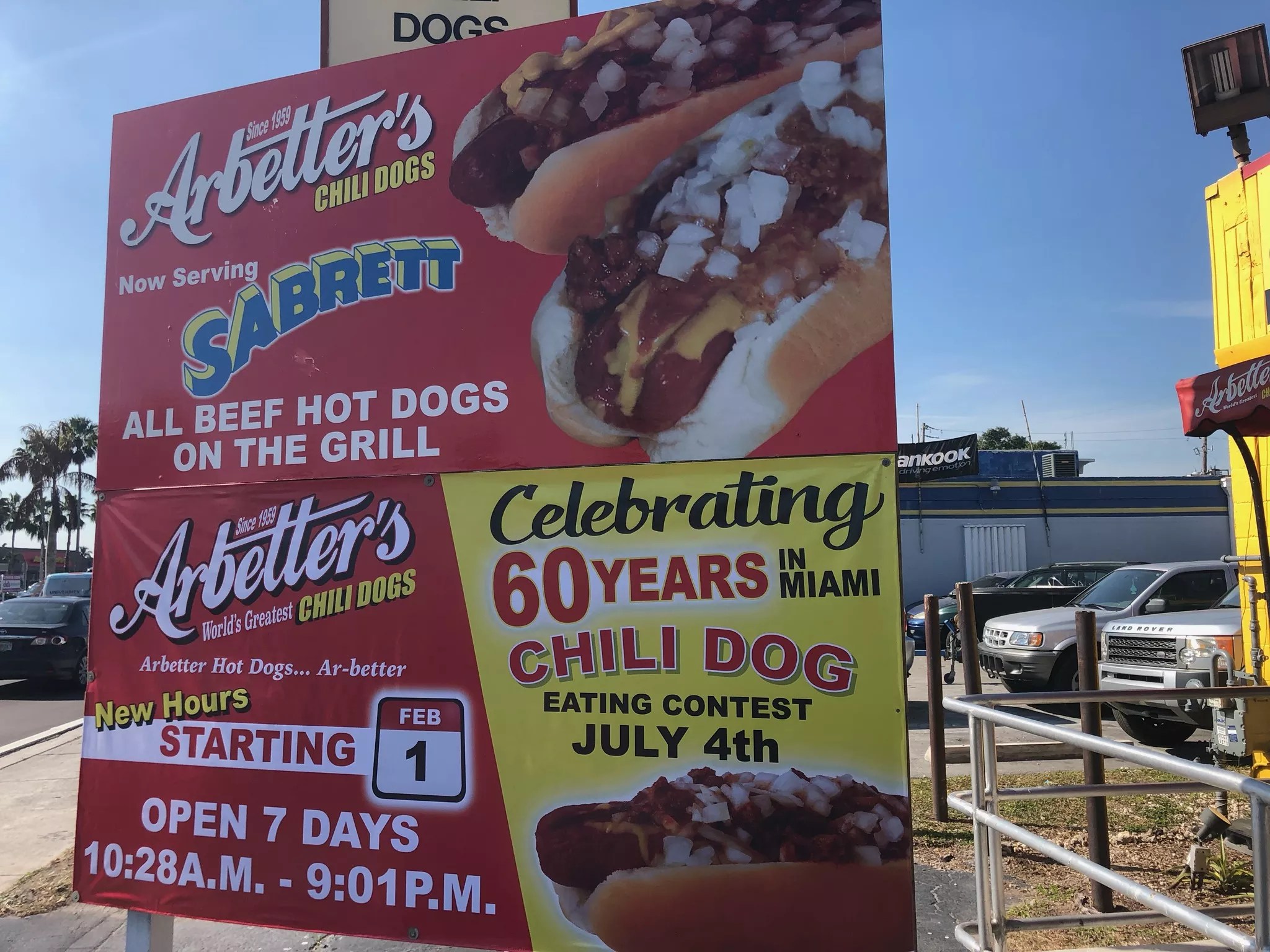 Arbetter’s Hot Dogs. 8747 Bird Rd., Miami; 305-207-0555; arbetterhotdogs.com. Sunday through