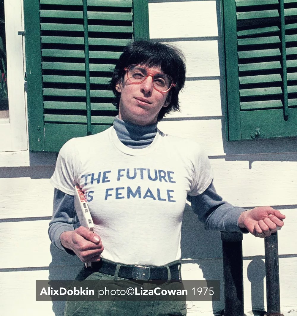 Liza Cowan’s “The Future Is Female” T-shirt design for Labyris Books, worn by Alix Dobkin.