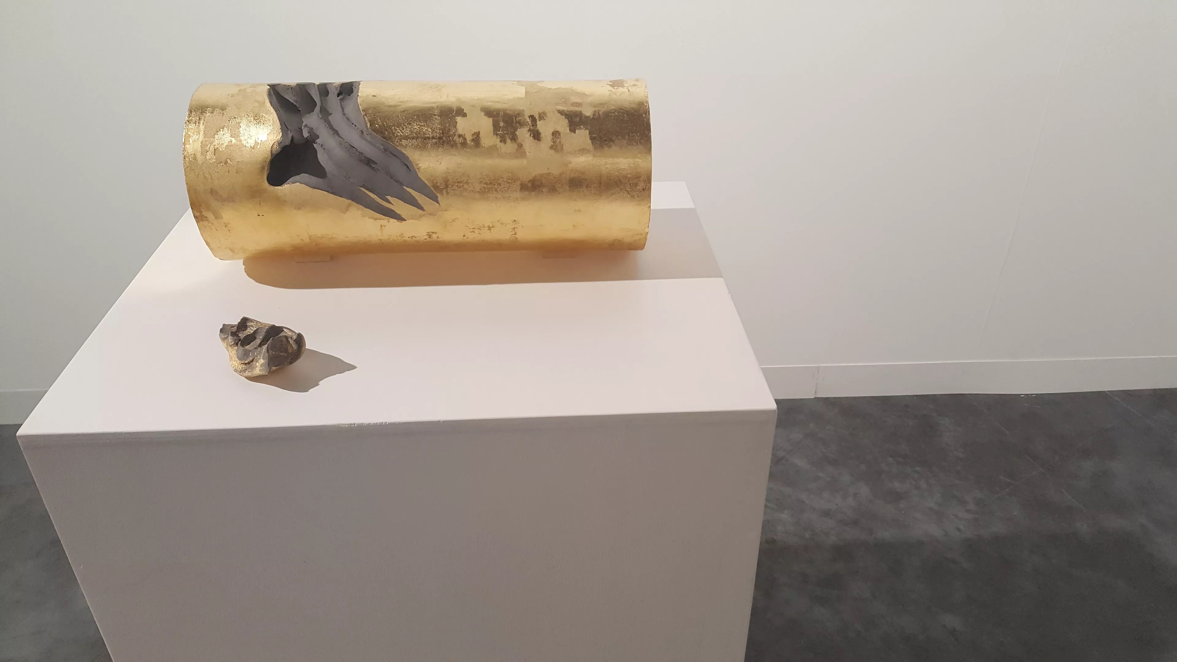 His isn’t the only work at Basel this year that employs a certain degree of glitz, although other pieces aren’t quite as pointed. Works by Michele François’ and Pascal Marthine Tayou cover materials in gold leaf, gold paint, or even 24-karat gold. Jack Pierson’s text piece uses gilded and yellow lettering reminiscent of the Golden Arches as much as the Gilded Age. An installation from Paola Pivi employs hundreds of strings of freshwater pearls in thick bouquets lined along a wall in gentle gradients of white, pink, gray, and brown.