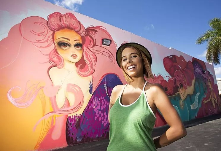 Take a stroll through Wynwood Walls, and you can’t miss her: Lying in a dreamlike pose, surrounded by grapevines, a nude woman gazes into the distance. But it’s not her nudity that’s so arresting, nor her vibrant red hair or pointed, clawlike fingertips. It’s not even the tiny alligator, with a cheerful, menacing smile, that sits on her elbow. It’s her eyes, which artist Tatiana Suarez has rendered in hyperrealism with one fantastical quality: They’re entirely white aside from soft red pupils. Striking eyes have long been a hallmark of Suarez’s work; her earlier murals and paintings show women with oversized globes for eyeballs, making her subjects look more like thoughtfully created Bratz dolls. But these aren’t just pretty portraits. Suarez’s paintings have a surreal, dreamlike quality, one that invites viewers to imagine the story behind her captivating female subjects. Unlike so many of the women on display in Miami, these ladies aren’t merely ornamental. Suarez gives them a realistic, human quality, even as she places them in dreamscapes and exaggerates their features. In a city full of objectifying billboards, advertisements, and even other murals, Suarez’s work is a small, essential rebellion.