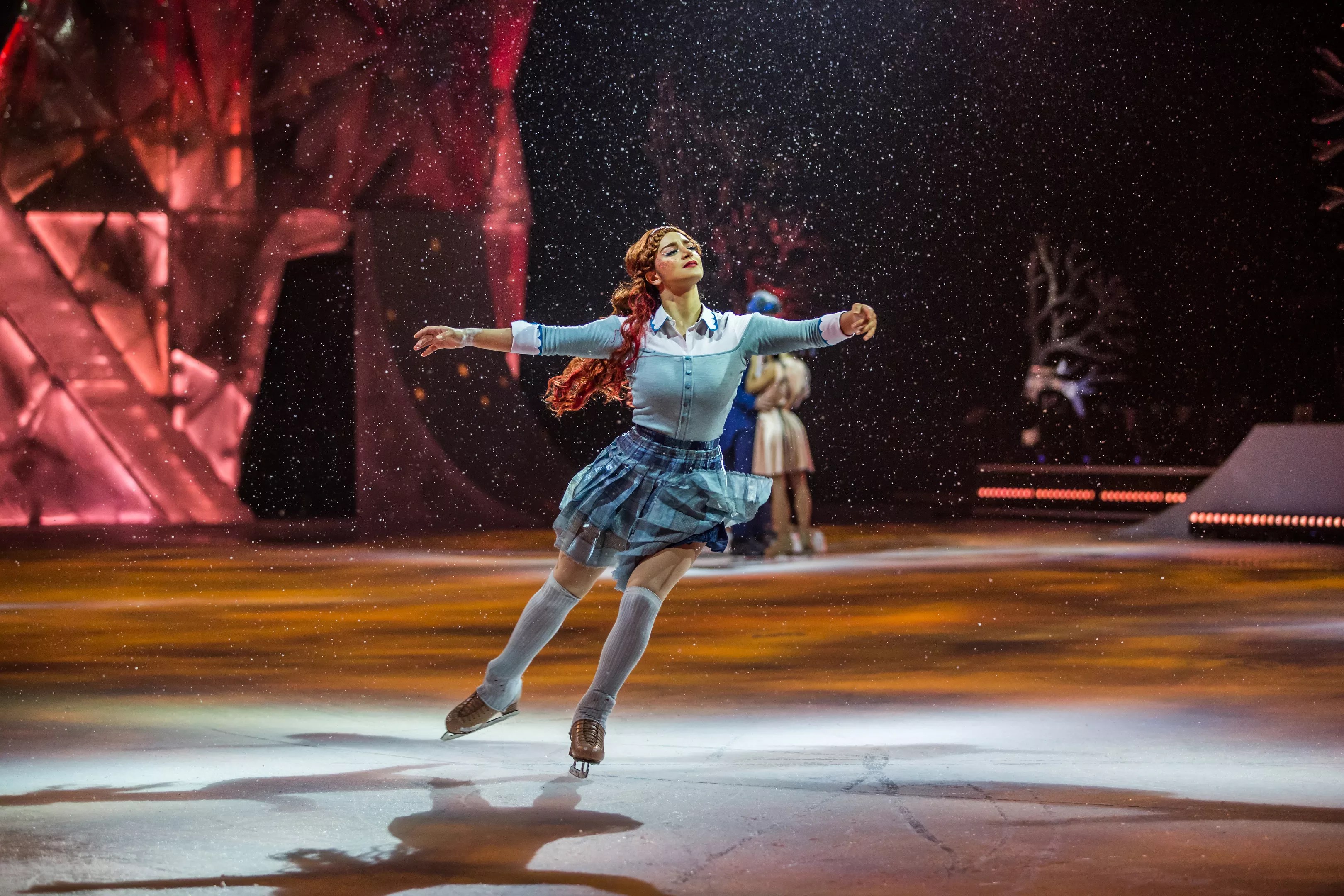 According to Lemire, the show boasts 43 artists, including 19 skaters, three live musicians, and a number of acrobats. The set mimics a “living scrapbook,” with a town square-like feel sitting adjacent to a massive pond. The tunes are a hybrid of orchestral moments, live violin, keyboard, and guitar as well as one-of-a-kind covers of well-known pop songs.