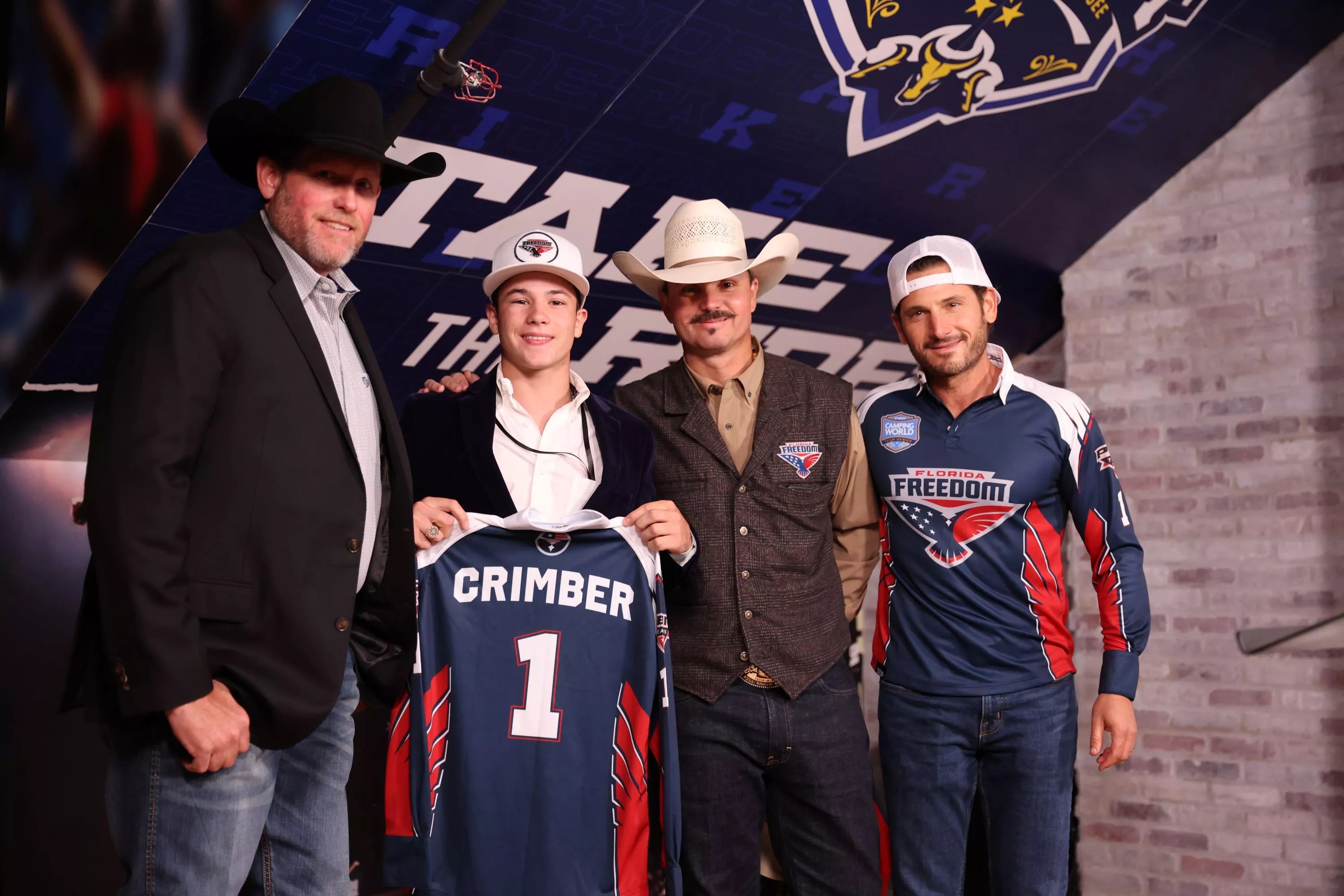 Florida Freedom coach Paulo Crimber (second to right) poses with his son and bull rider, John Crimber (second to left)