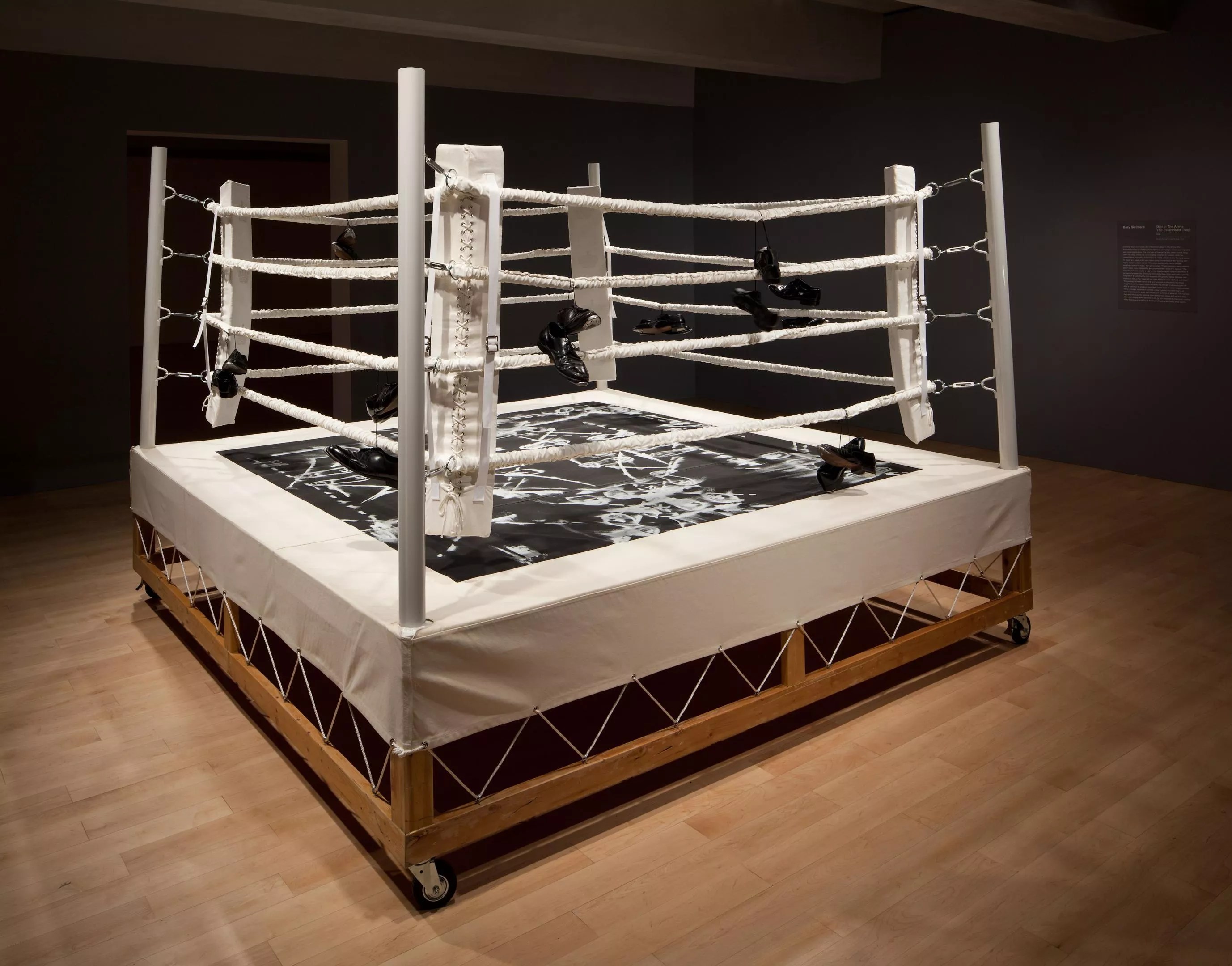 The body – or lack thereof –is the focus of Simmons’ installations. Step Into the Arena (The Essentialist Trap) features a boxing ring, empty but for the gloves hanging on the ropes and the chalkmarked dance steps diagramed on the mat. The athletes who put their bodies on the line for our amusement are gone, the only remnant being how they moved. Other installations feature boxing memorabilia – the pair of robes in Us & Them, the monogrammed pair of gloves in Everforward – but no one to wear them.
