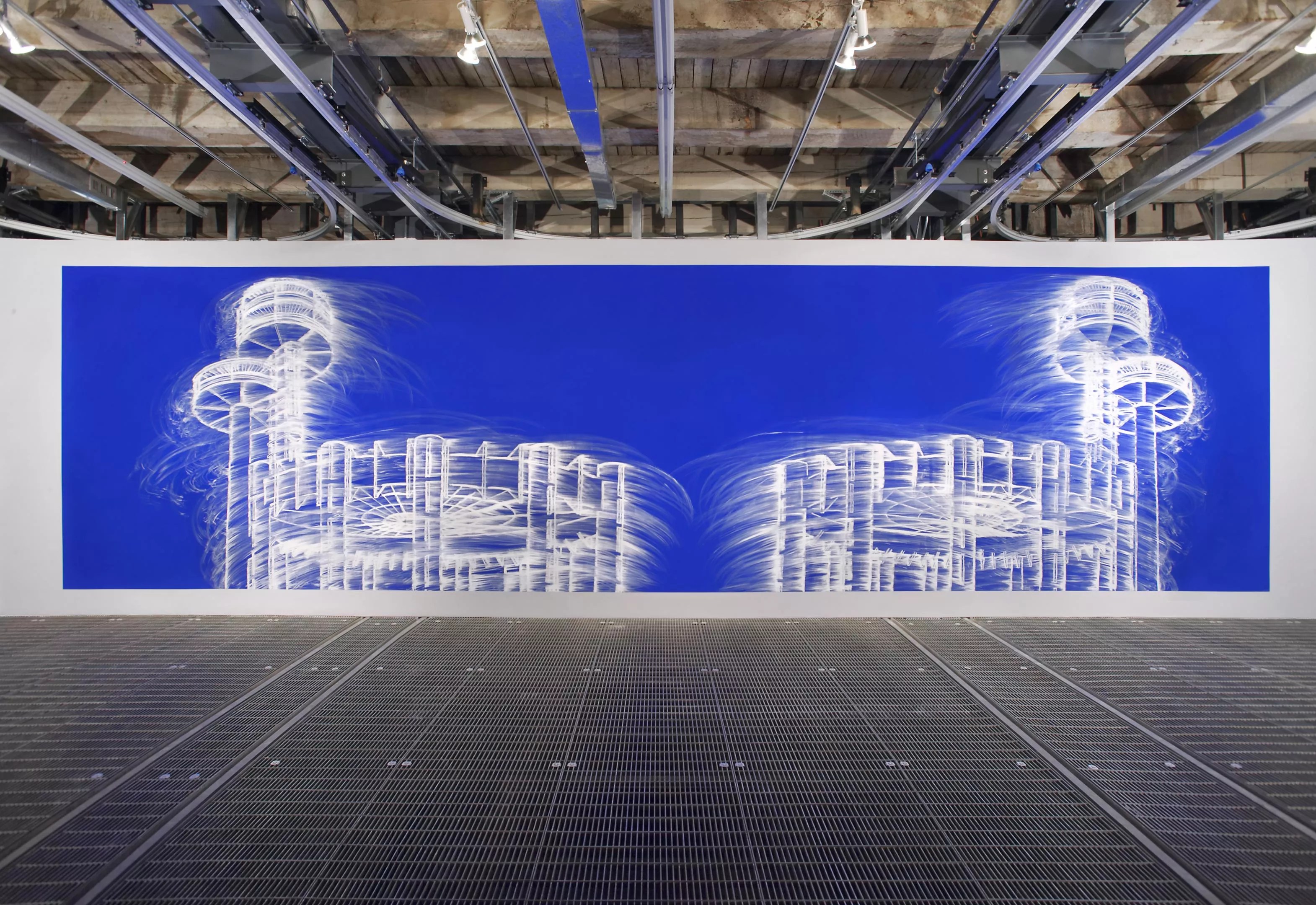 Johnson was a Nazi sympathizer. Robert Moses, the urban planner who organized the fair and built Flushing-Corona Park, displaced vast amounts of Black and brown people and redlined and destroyed entire neighborhoods to build New York’s highways in the name of “urban renewal.” Double Cinder places the dark side of progress in starker relief, depicting a pair of housing project tower blocs, the chalk smears reaching up like flames. An obvious reference to the burning of the Bronx aside, what is being erased in this picture? Many of the most infamous failed public housing projects of the 20th Century – Cabrini-Green in Chicago, Pruitt-Igoe in St. Louis – were, in a sense, doomed from the start, thanks to neglect and poor policy decisions made by racists like Moses. They were demolished, and so was the World’s Fair pavilion. The buildings may have vanished, Simmons says, but the ideas and attitudes behind them remain, influencing our lives in untold ways.