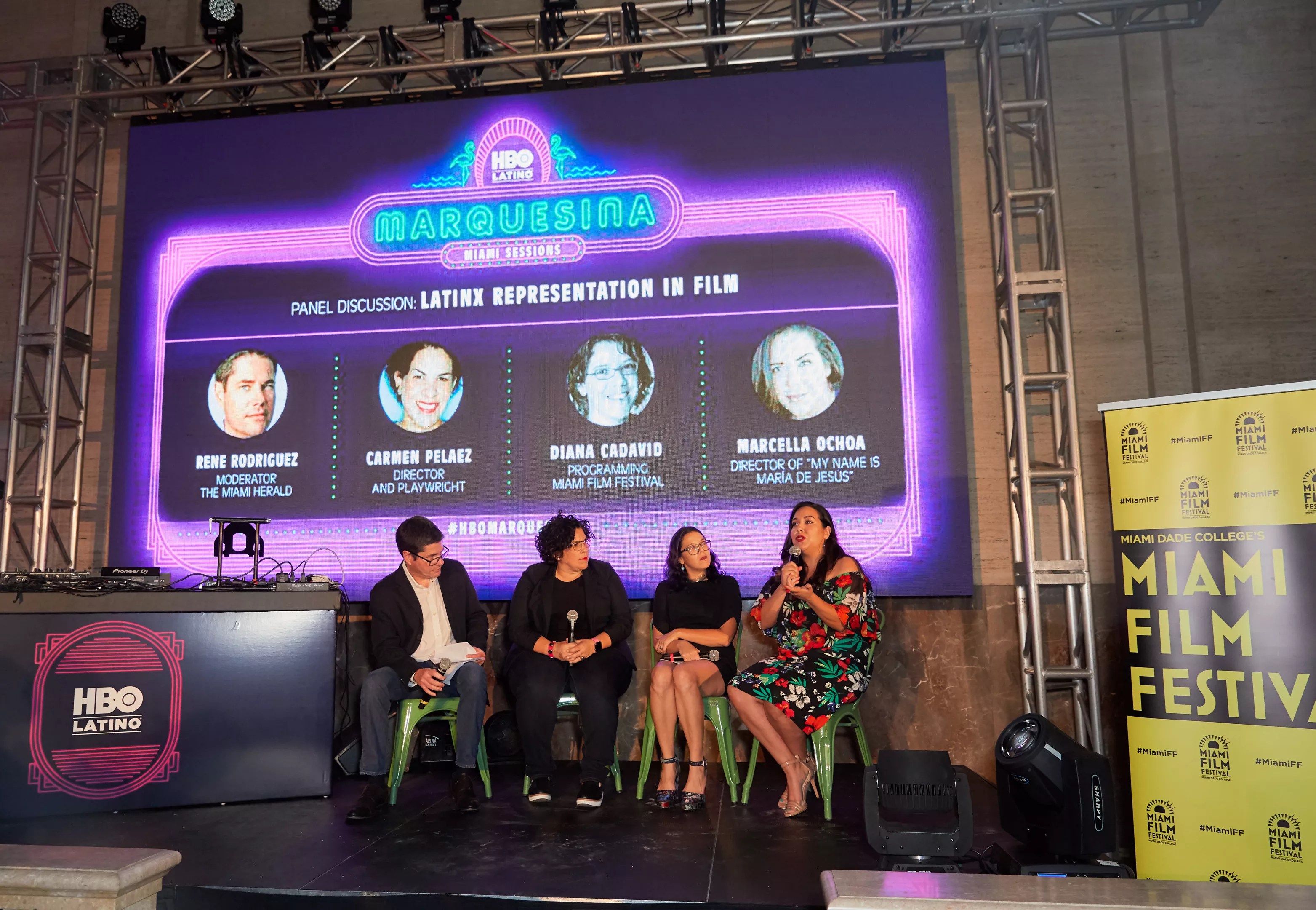 Panelists Rene Rodriguez, Carmen Pelaez, Diana Cadavid, and Marcella Ochoa discuss Latinx represention in TV and film at HBO Latino's Marquesina Sessions in Miami.