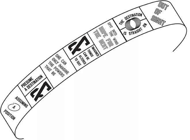 Inviting viewers to participate in its narrative, Out of Sight takes them on a journey of self-actualization. As they travel along the hopscotch squares, the artist puts the creative process in their hands. They perform an active role in bringing the work to life with each new interpretation of phrases and commands such as “Spit into the wind, hope for the best,” “The destination is straight on,” and “Assuming a position.”