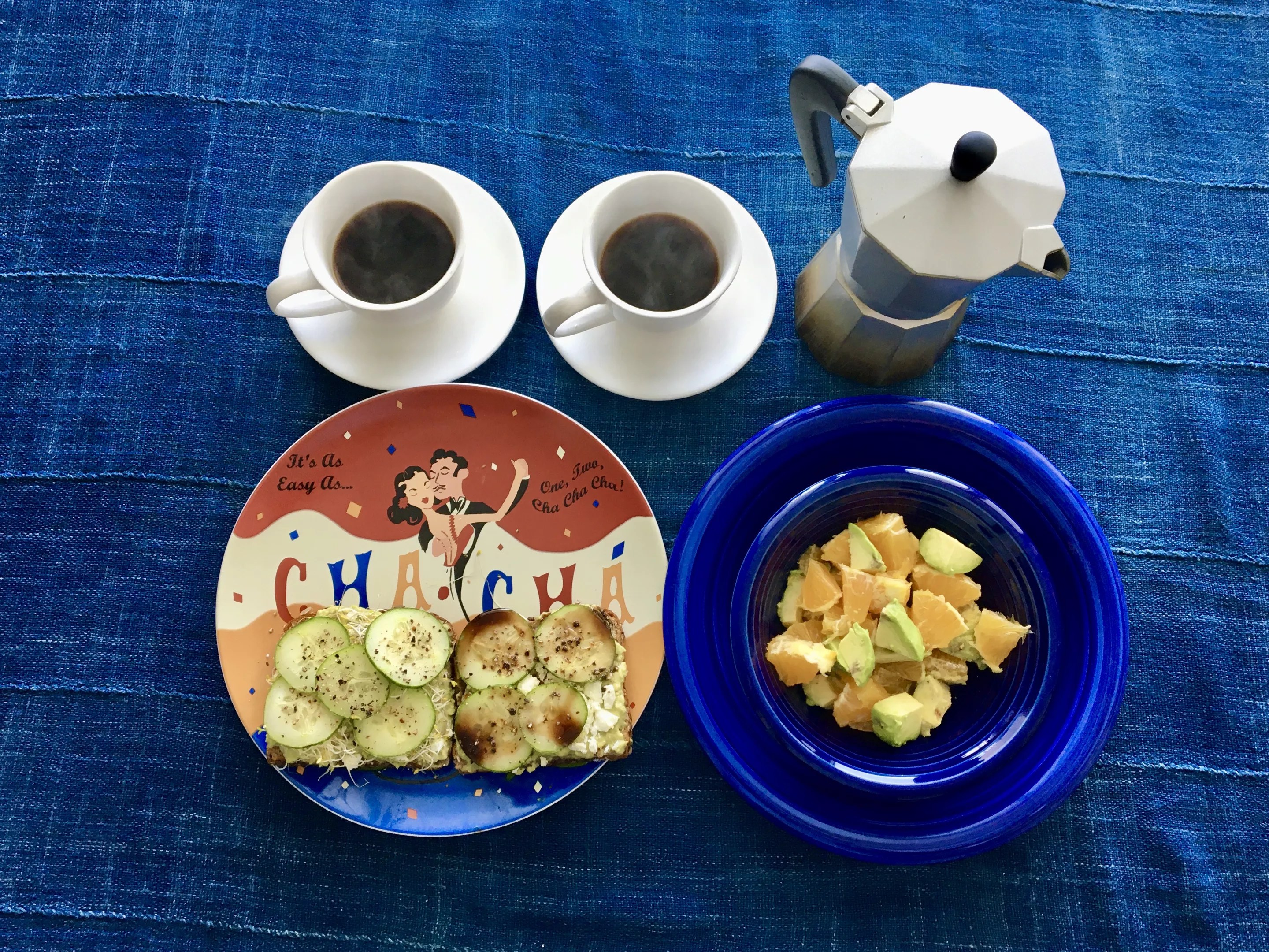 Cafecito and Cha, Cha, Cha: orange and avocado salad, open-faced cucumber and avocado toast sandwiches, stove-top expresso, and retro Cuban dance plates.
