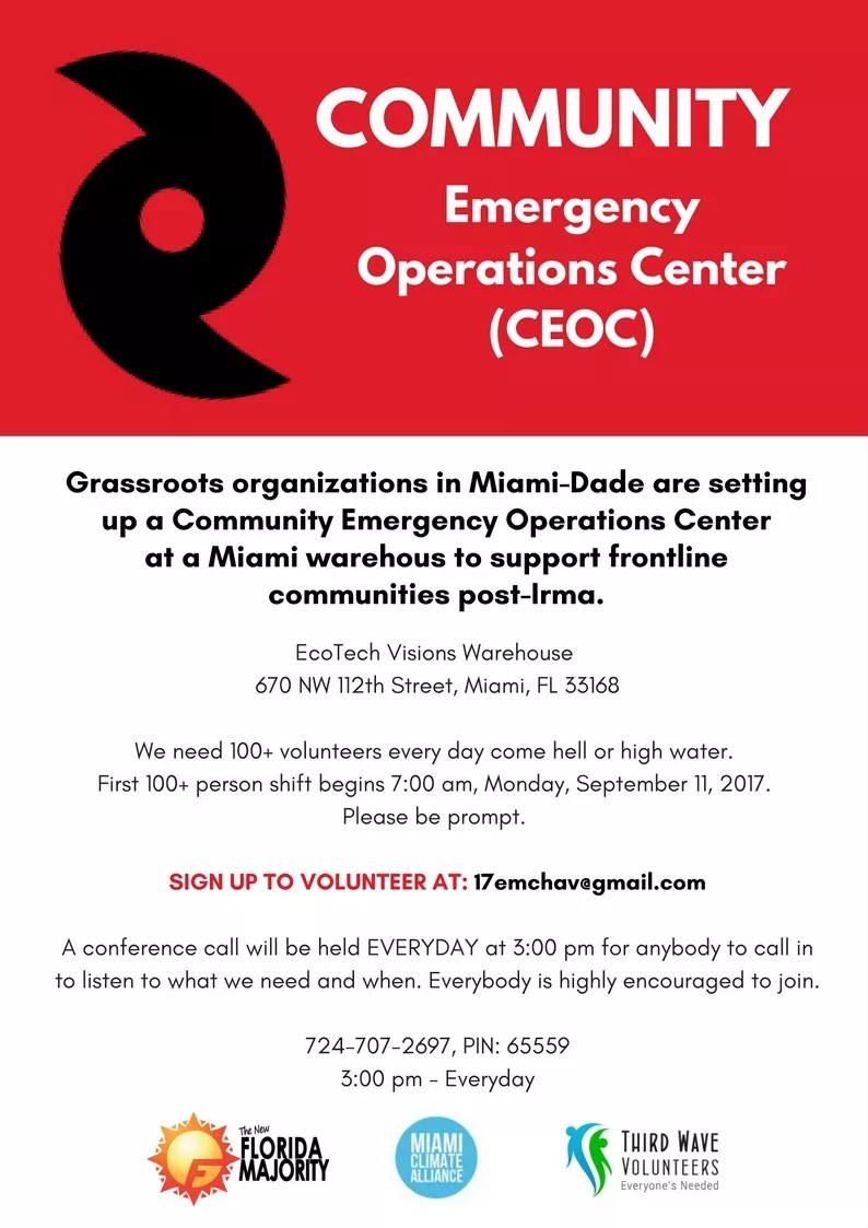 The Community Operations Center (CEOC) will help people in the frontline of need both locally in Miami-Dade and in other Florida counties. CEOC is already working to create staging areas in the Florida Keys, Naples and Tampa.