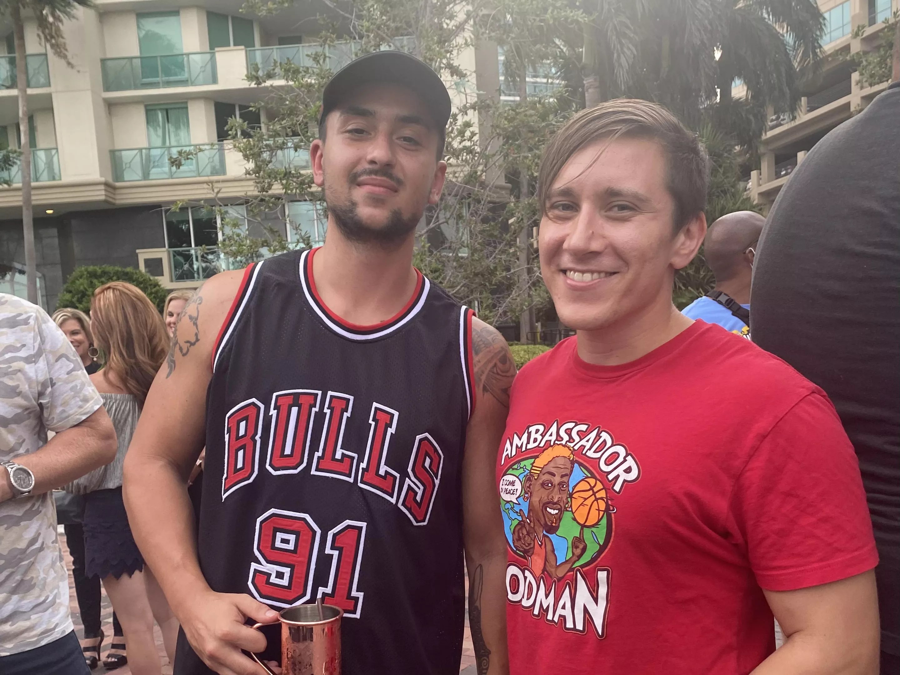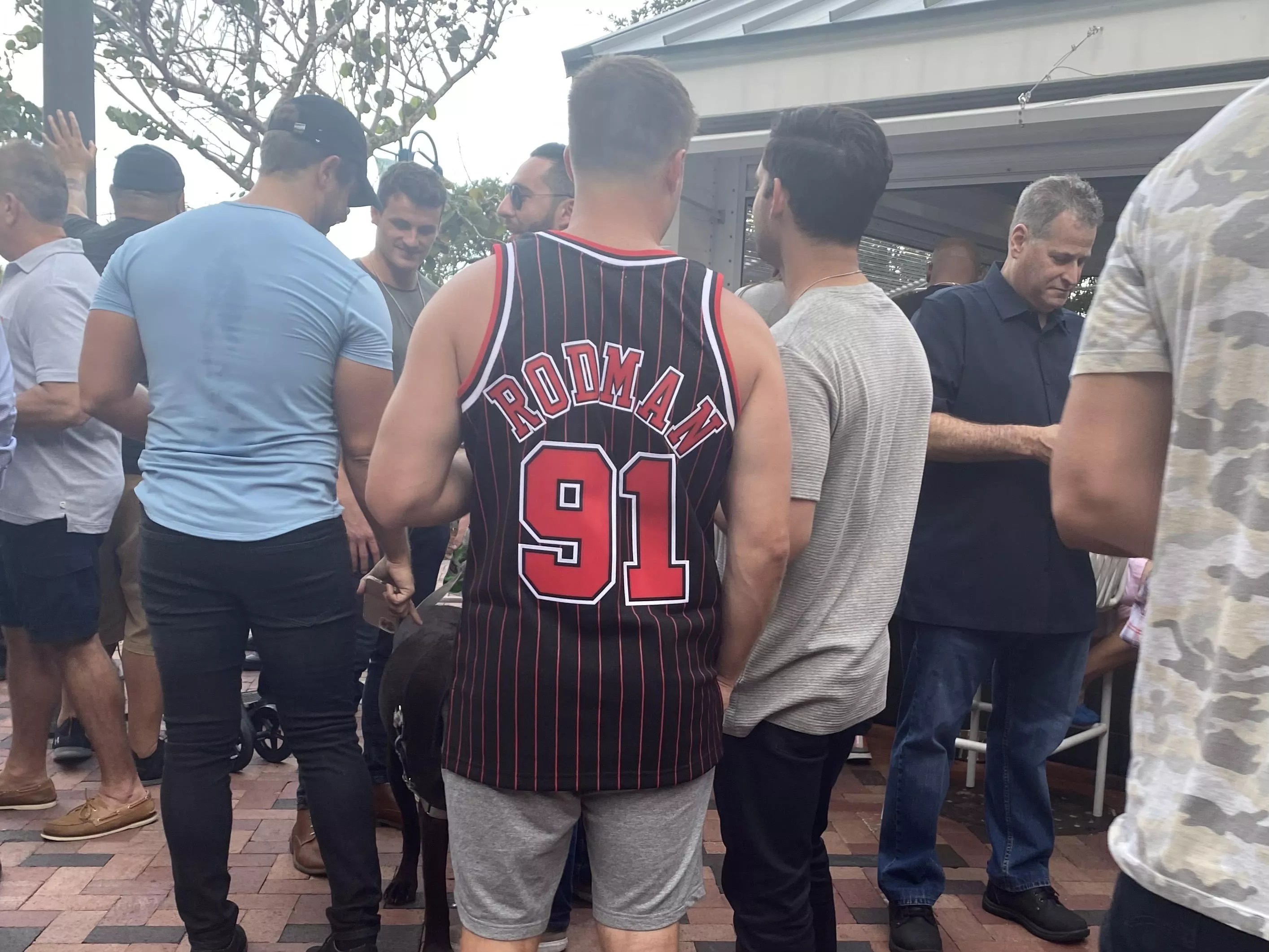 New Times is the third outlet in line to interview Rodman, who at this point is sitting at a waterfront table with three women, and two bottles of wine in an ice bucket. Passersby on the Intracoastal’s public waterfront pathway do double-takes. Some of the fans in Bulls jerseys leave Salt7 and walk around the block to said pathway to snag a closer look at Rodman, who seems unfazed by the mid-pandemic spectacle of fans attempting to take selfies with him five feet away.