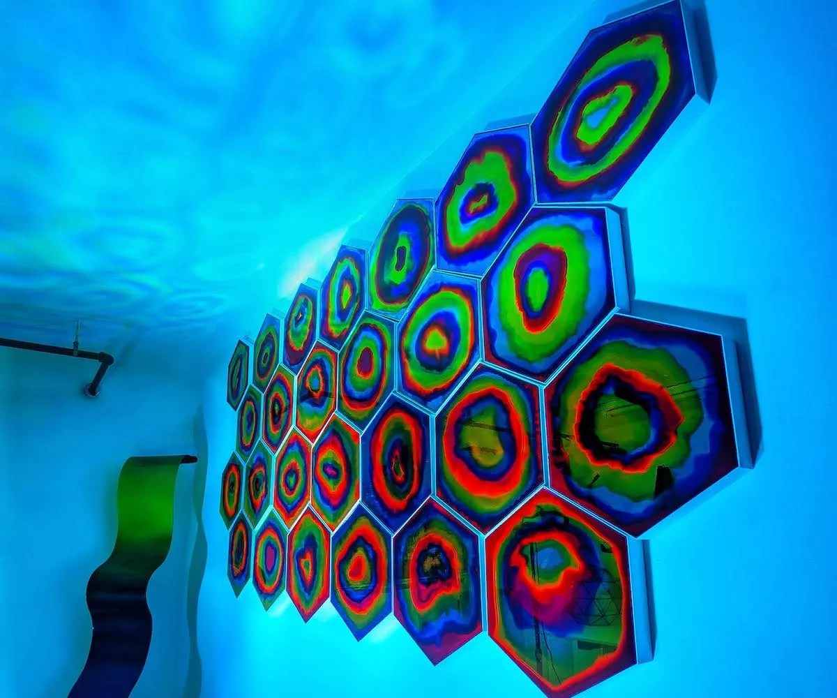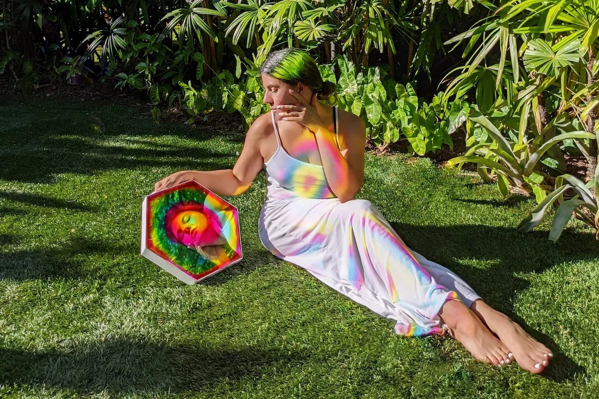 As you look in the mirror, you quite literally see yourself in a different light. The pieces are meant to provoke self-reflection while also inviting a sense of happiness. The result is an almost psychedelic experience.