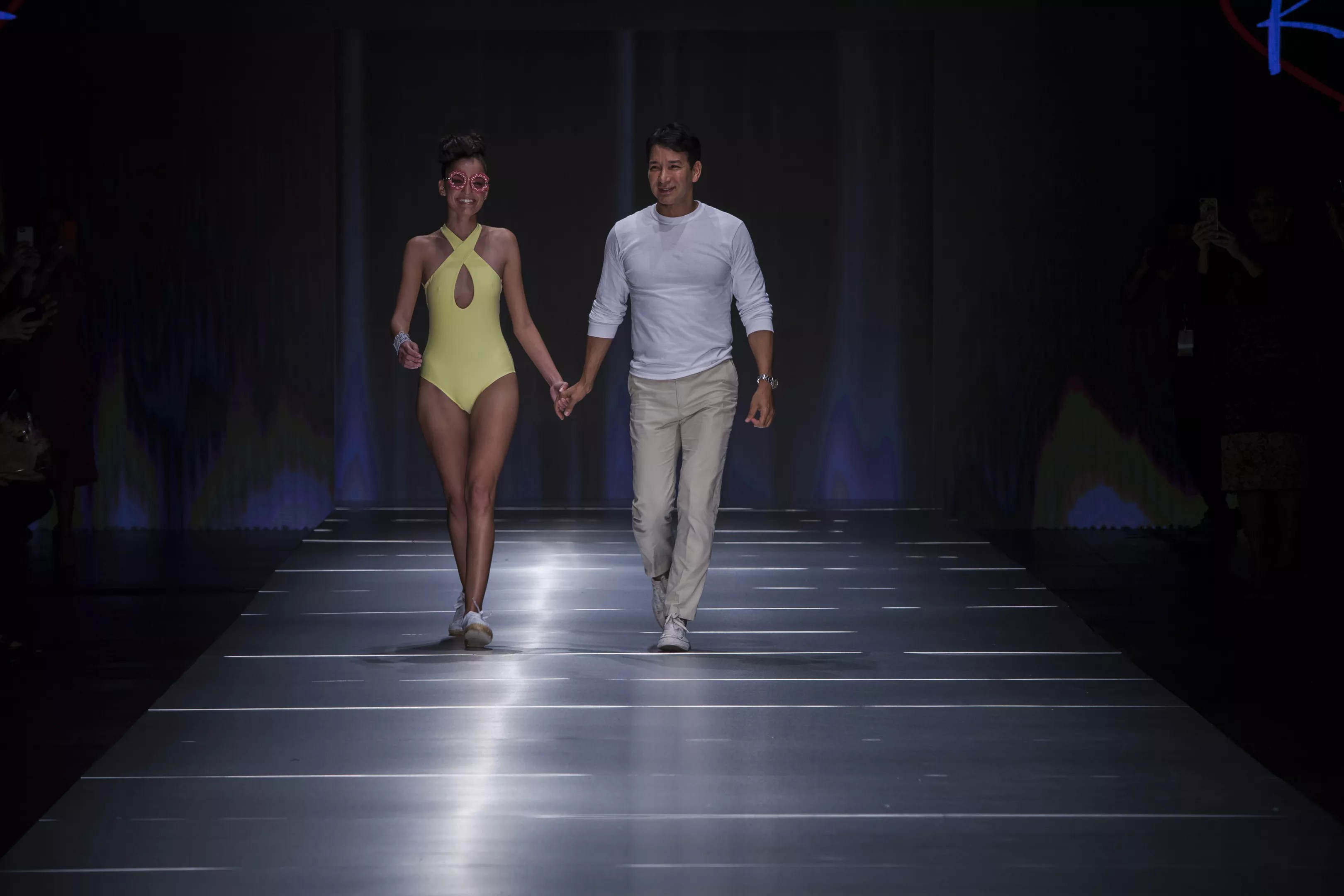 Rene Ruiz walks the runway alongside a model sporting one of his resort-wear looks.