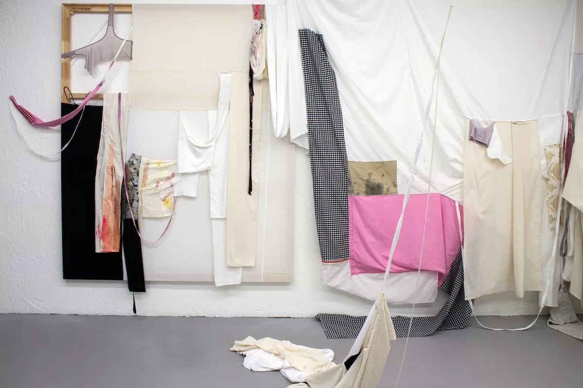 “Chrystie Street” combines a variety of fabrics – muslin, gingham, and pieces of clothing – attached to a wooden frame. There are fragments of lingerie, the arm of a T-shirt, and a handcrafted sock similar to that used in the suui dressing. In the front of her studio, Park has a pair of Singer sewing machines where she transforms with fabric the memory of lives, now flattened, stretched, and deconstructed.