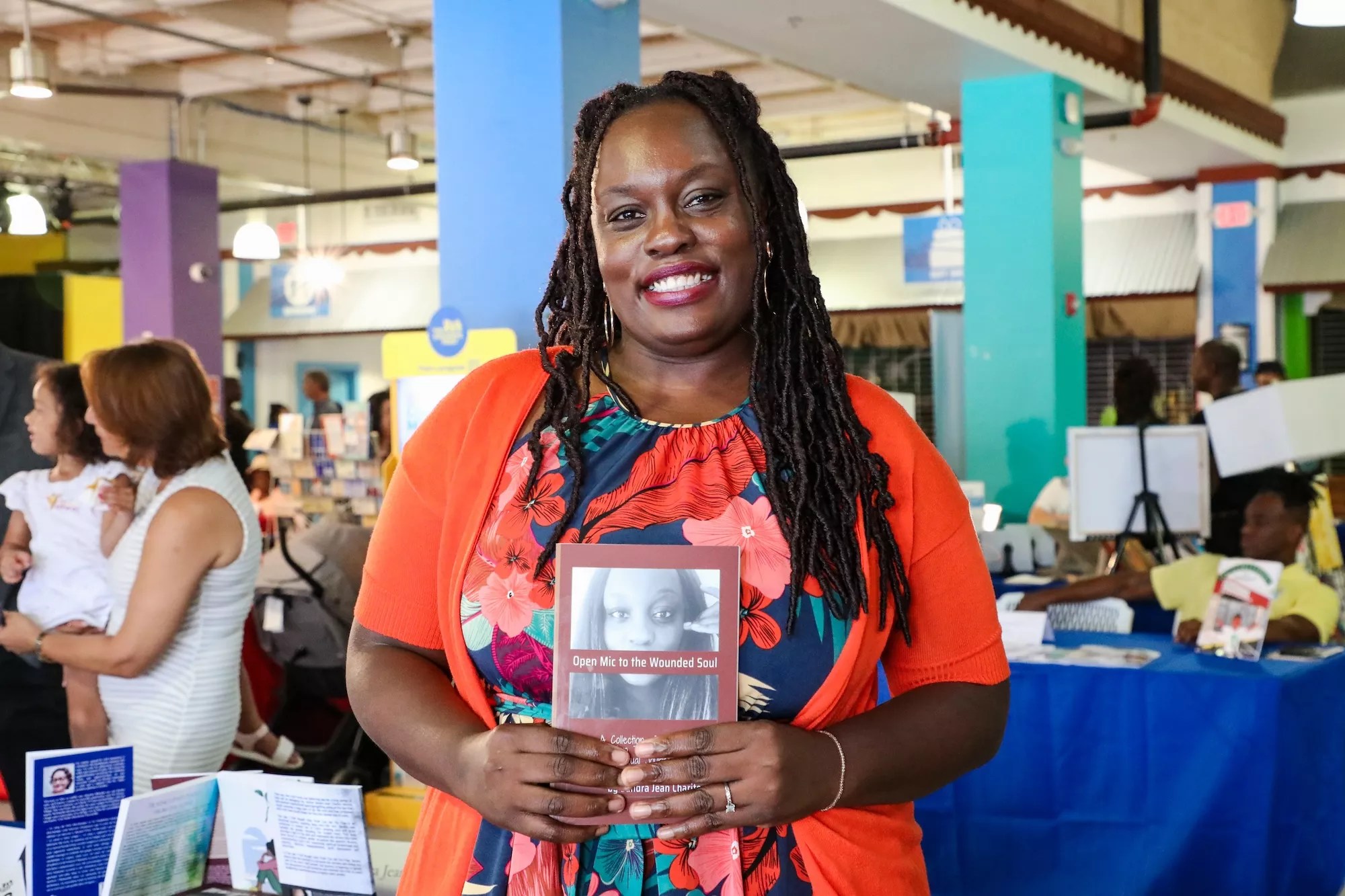 Sandra Jean Charite, an author at the marketplace at the Little Haiti Book Festival. The festival features books available in several languages, including English, Haitian Creole, and French.