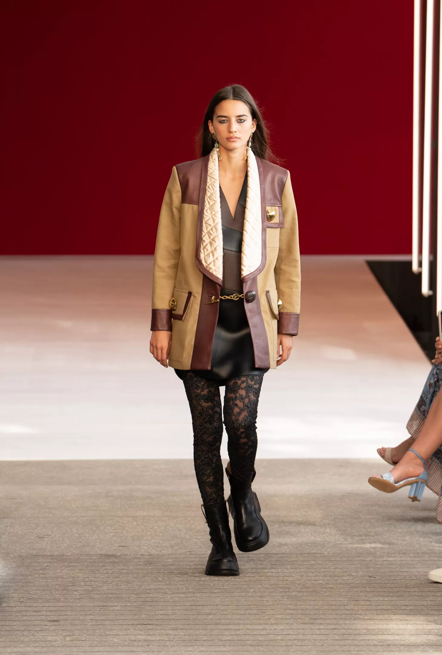 Pieces included unconventional elements such as belt buckles similar to a trunk’s clasp, a leather sleeveless top with a turtleneck touch, knee-high checkered pattern boots with chunky platforms, a graceful tiger printed coat, and the most unexpected highlight of the collection: the large zipper detail on a majority of the looks.