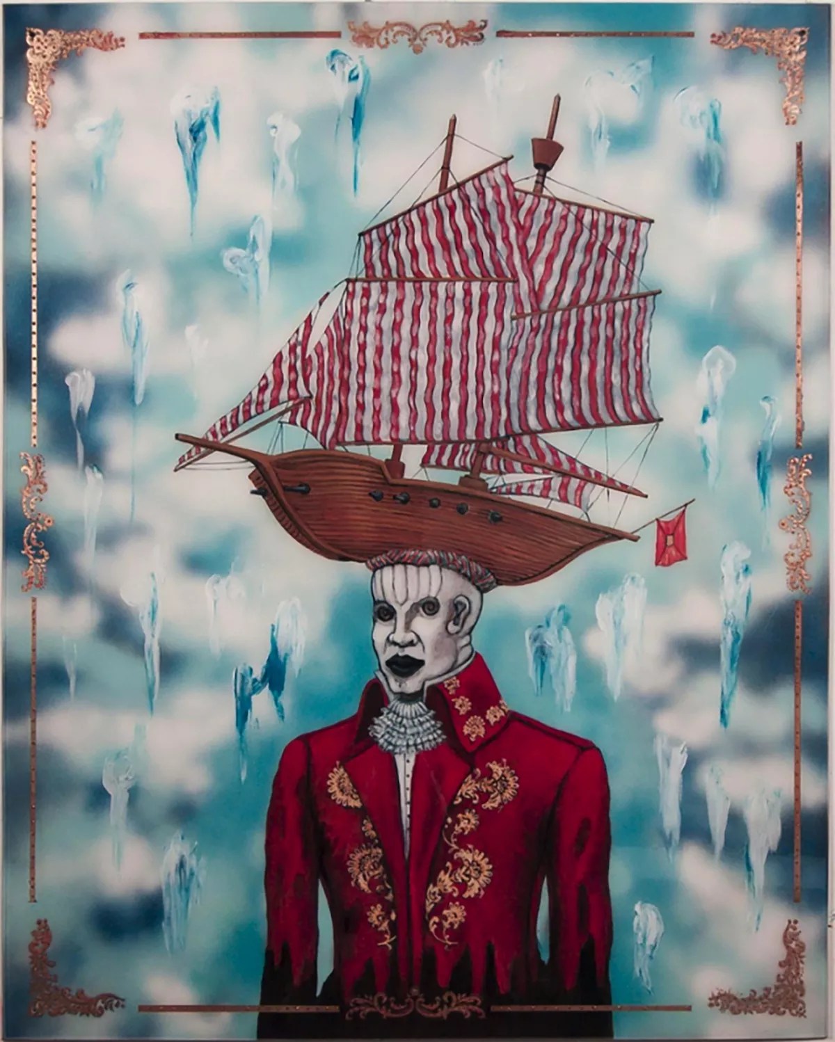 In La Fin de Ti Noel (2017), a goose-like creature sporting a man’s tepid grin is flanked by lush flora and an ornamental frame; Makandal Senvole (2017) depicts an insect hovering over an unkempt kingdom; and Capitan Tonniere (2017) portrays a Colonial-era figure whose head has transformed into a sugar boat, a familiar icon in Duval-Carrié’s work. In blending man with beast or boat, the artist highlights the need for escape. His work is rendered on Plexiglas and aluminum, a purposeful choice of material.