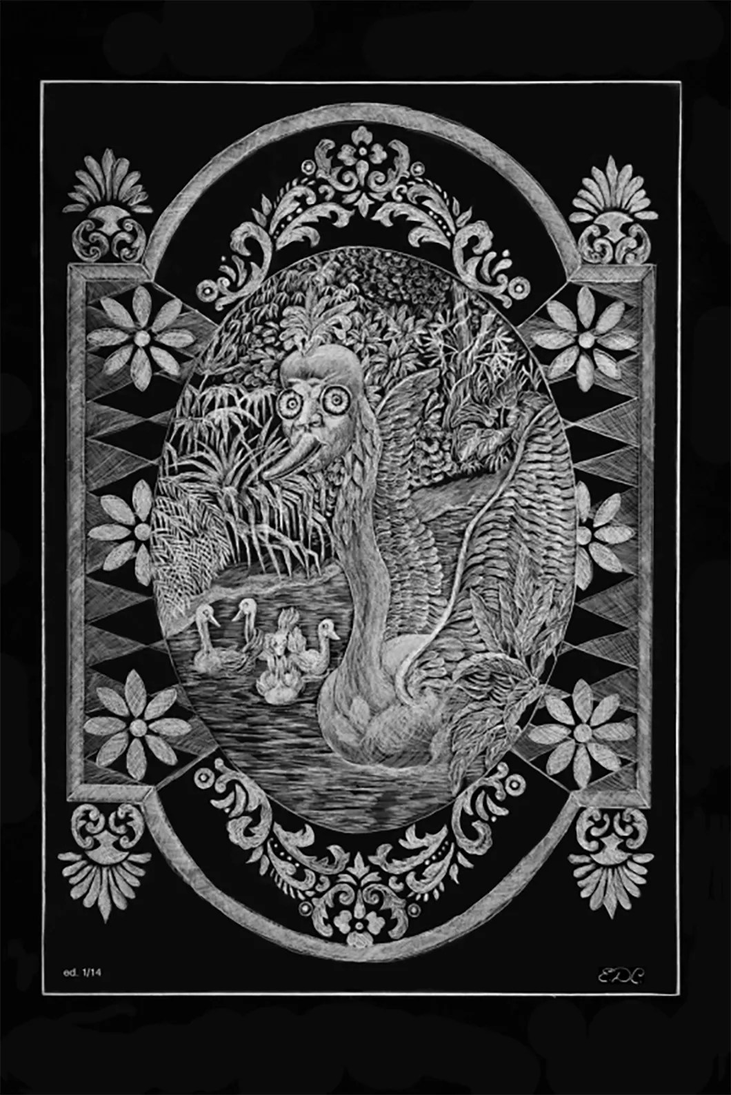 Duval-Carrié’s musings on slavery and its inherent consequences on American immigrant culture are especially apparent in these diverse works, which are loaded with the artist’s familiar motifs. Interpreted vividly through his characteristically lush etchings, symbolic iconography, and colorful mixed-media works, “Metamorphosis” leads the viewer to reckon with the sense of displacement so fundamentally engrained in immigrant life. Etchings of shape-shifting men against the backdrop of a vibrant Caribbean landscape reference the notion that immigrants – whether brought against their will or searching for a new life – are forced to remain hidden to maintain equilibrium within the system.