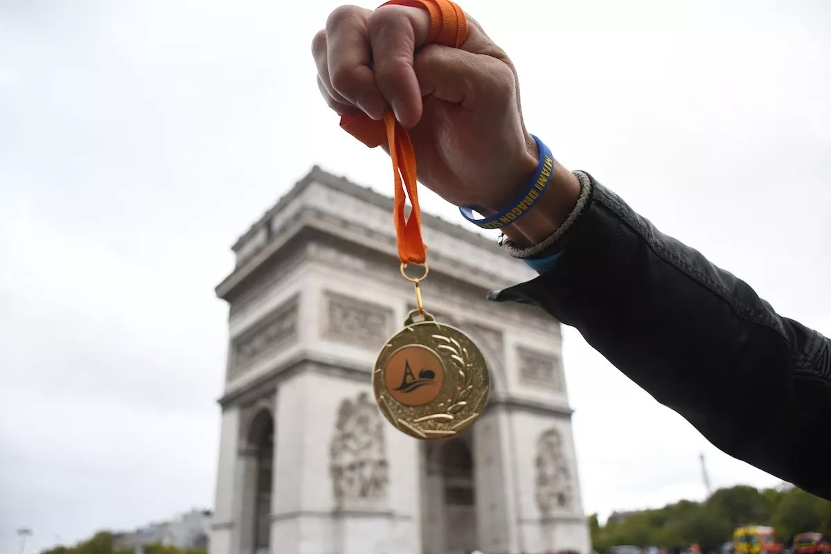 Despite the pain and a momentary fear of seeing my predawn breakfast of off-brand Nutella and poundcake again, the Slayers pushed through the last six kilometers and hit the finish line at 2:34:50 – ten minutes ahead of the next dragon crew. As we finished, French fighter jets streamed red, white, and blue overhead, honoring former President Jacques Chirac, who had died earlier in the week.