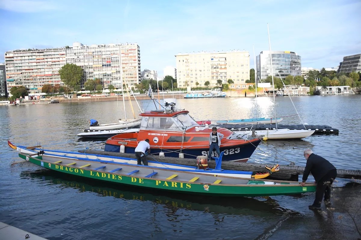 In Paris this year, the race began at daybreak September 29 just outside the city limits, near the Boulogne-Billancourt neighborhood. The course took teams to Île de la Cité, where they turned and headed back to the start. There were 54 entries: kayaks, stand-up paddleboards, and canoes, along with the dragon boats. Another 300 or so participated n a 15-kilometer combo race and leisure float that began near the halfway point.