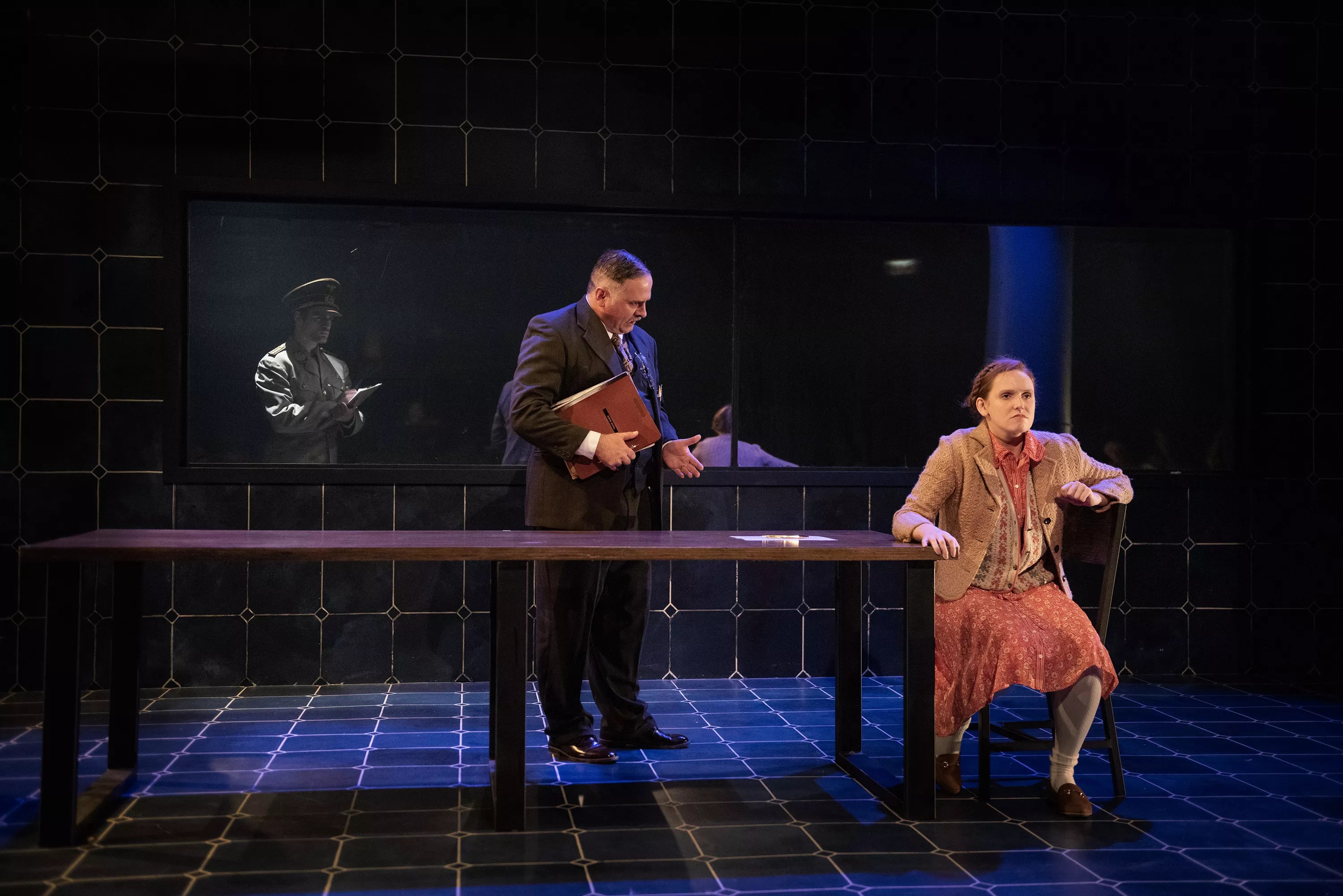 Jason Peck’s Kurt Grunwald interrogates Meredith Casey’s Sophie Scholl.