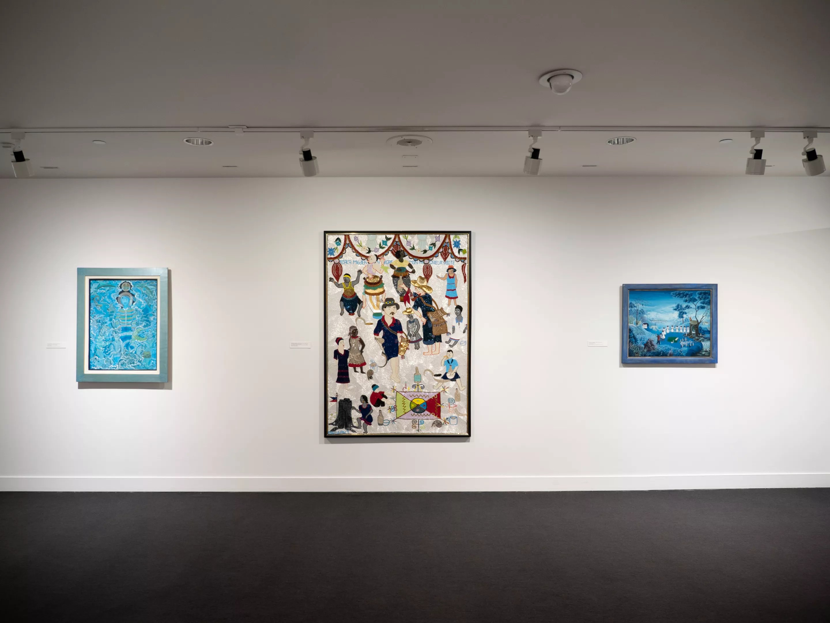 “One day when I was sleeping by the sea, a mistress, Erzulie Fréda, appeared and said to me: I will show you how to paint me,” Zéphirin relates in the wall text for the work. “She then picked me up, transported me underwater into a marvelous world inhabited by women of all colors, very beautiful in their transparent dresses. There, she showed me an infinity of paintings arranged on easels, ordering me: ‘These paintings do not exist yet; it is you who will have to make them!'”