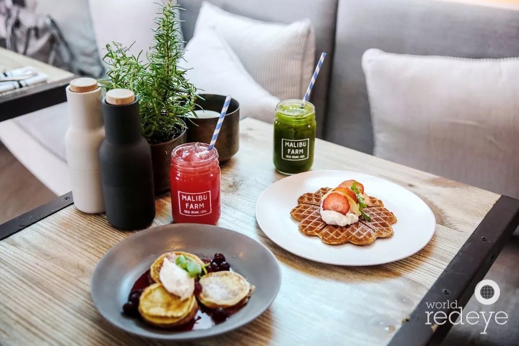 Swedish Mini Pancakes: Whipped cream & seasonal berries,Watermelon Juice, I Heart Waffle, & Green Juice