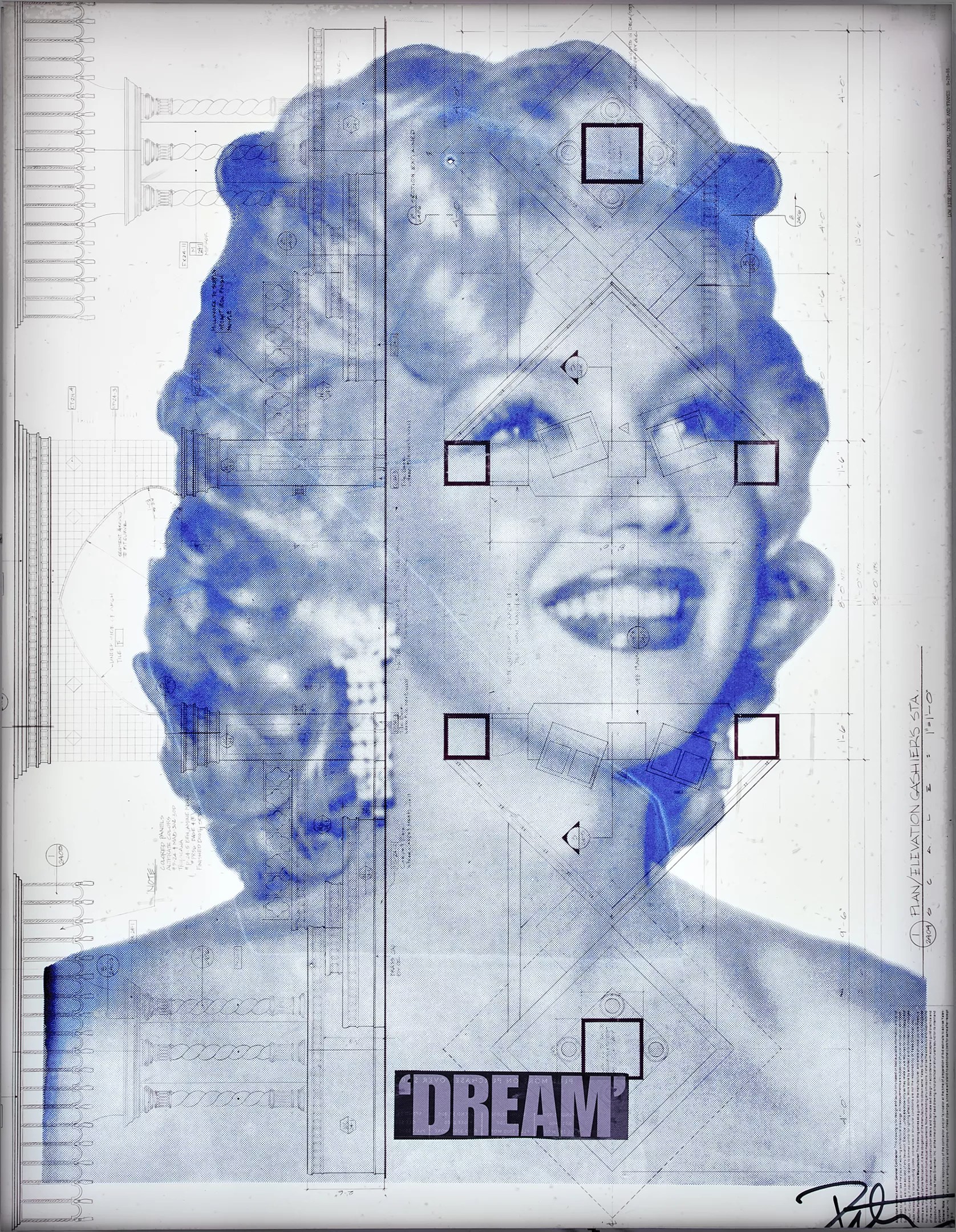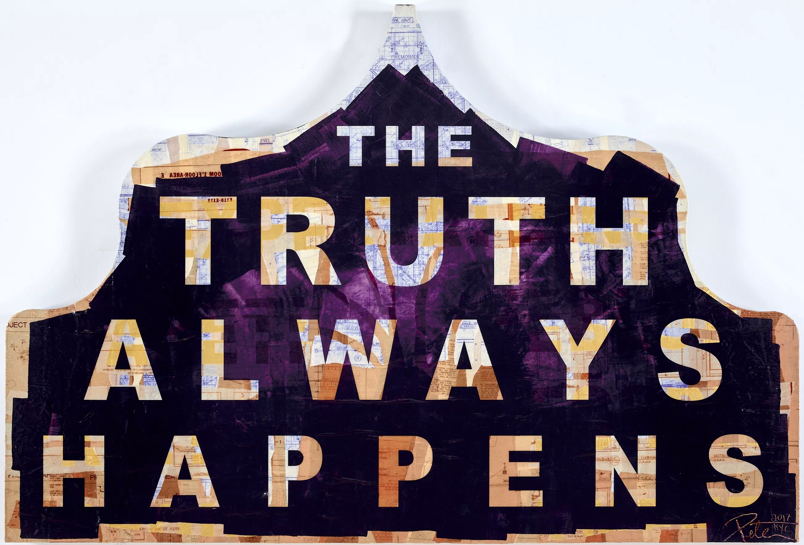 “Excerpts From the Taj Mahal” includes salvaged items from the hotel and casino that Tunney has branded with his own aesthetic and go-to slogans such as “It’s all good,” “We live in a beautiful world,” and “Don’t panic.” Among the items are marquee light boxes, torn wallpaper, and construction blueprints.