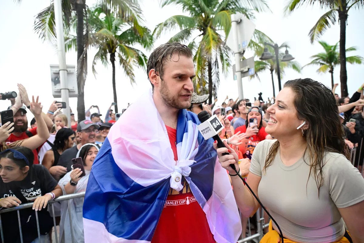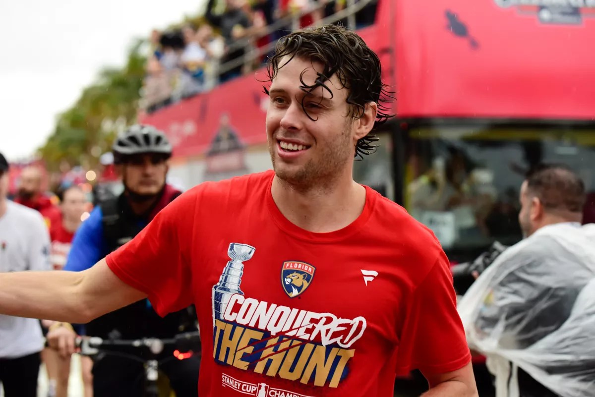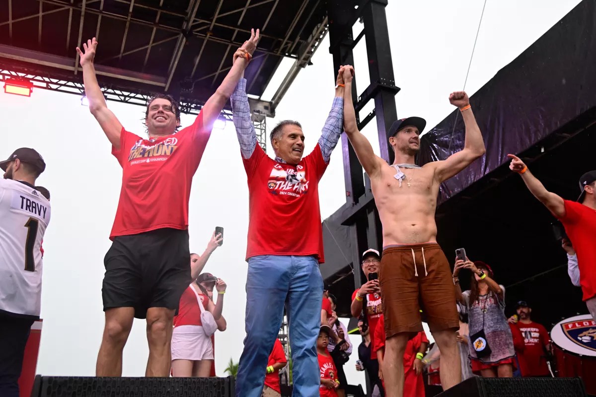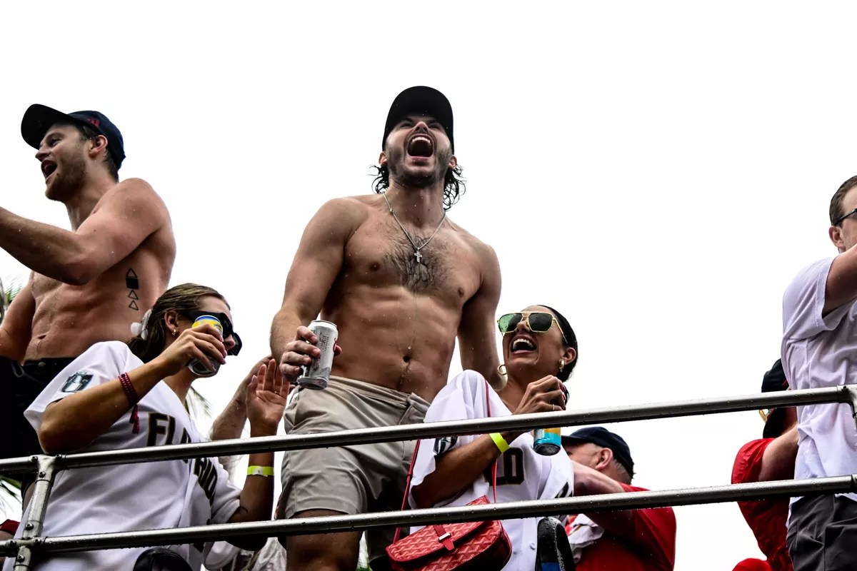 Some Panthers even descended from their bus-top perches before the procession reached the stage at the end of the parade route – perhaps most notably Matthew Tkachuk, who stopped off at the iconic Elbo Room watering hole. (Not long afterward, Tkachuk would reprise his Tuesday-afternoon Stanley Cup trophy dip in the Atlantic.)
