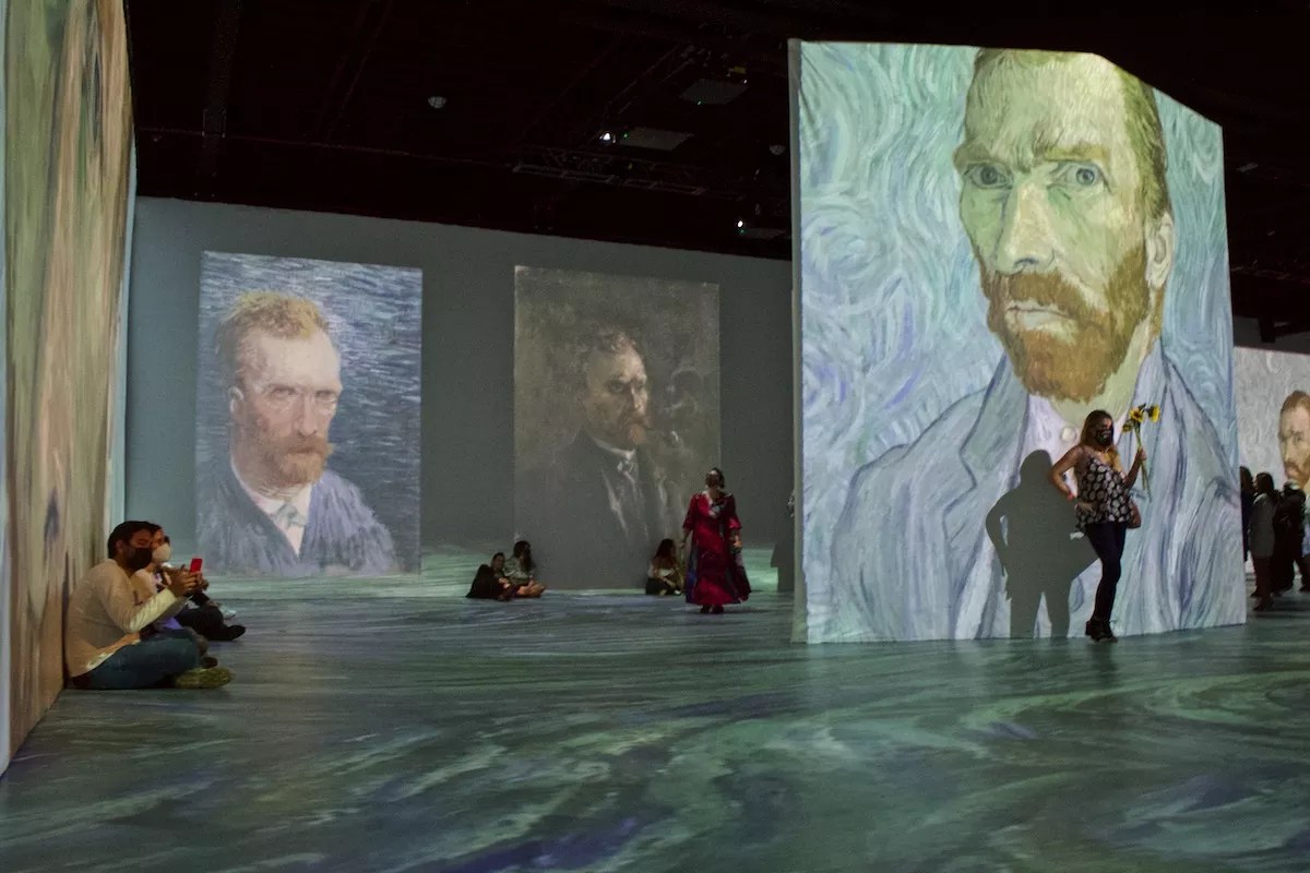 In this massive space, ambient music plays as viewers behold digitized movements of Van Gogh’s works projected onto the walls and floors. Sometimes just one work is projected; other times it’s a group of paintings, as in moments that are filled with multiple self-portraits. The most gratifying aspect of this experience is the ability to stand inside a Van Gogh masterpiece and feel part of the painting as the colors move around you and sounds transport you.