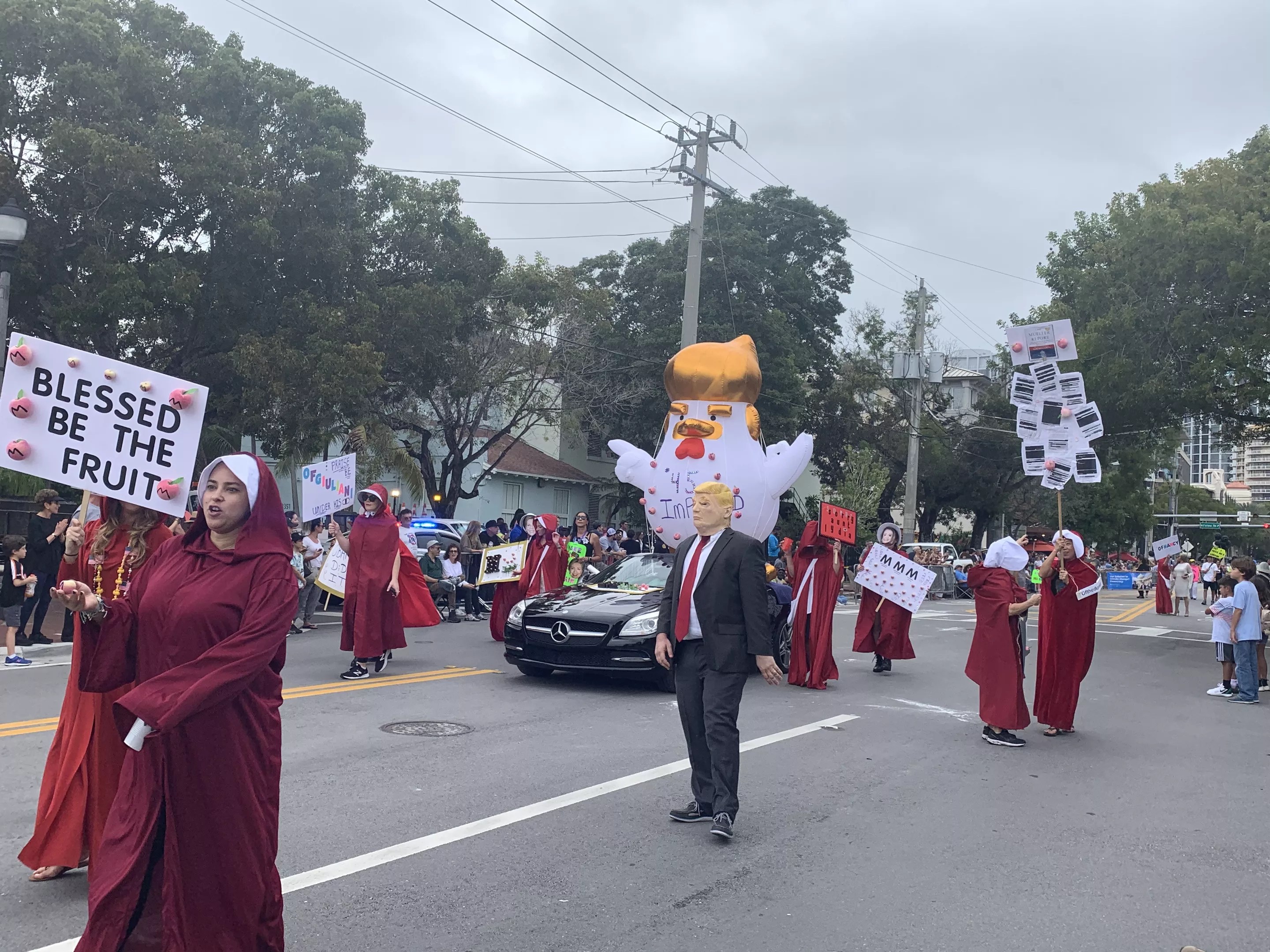 The Sierra Club’s demonstration would’ve made Greta Thunberg proud, for it included two Thunberg lookalikes. Not far behind the second doppelgänger marched her high-profile bully, this time in inflatable-chicken form complete with a blond toupee. A large group of people dressed in red robes and white bonnets surrounded the float as a way poking fun at the Trump administration’s policies that resemble the nightmarish life in The Handmaid’s Tale. “Blessed be the fruit,” they happily declared; in this case, the fruit was an “imPeach,” with dozens of peaches emblazoned on the group’s signs that named various handmaids, such as Ofdonald and Ofnancy. The lone visible Trump supporter in the crowd found the display hilarious and recorded a video of himself chanting, “Four more years,” while the group passed.