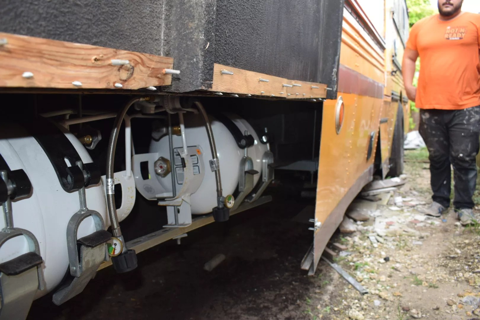 A prime example: the water supply. The bus came with two tanks: a 50-gallon freshwater and a 75-gallon graywater. The plan was to swap out the freshwater tank for a 75-gallon one. That required finding a way to lift the bus off the ground high enough to do the swap, but even when they elevated the vehicle as high as they could, it wasn’t enough to switch tanks. They resorted to digging a trench beneath the bus to give them the additional space.