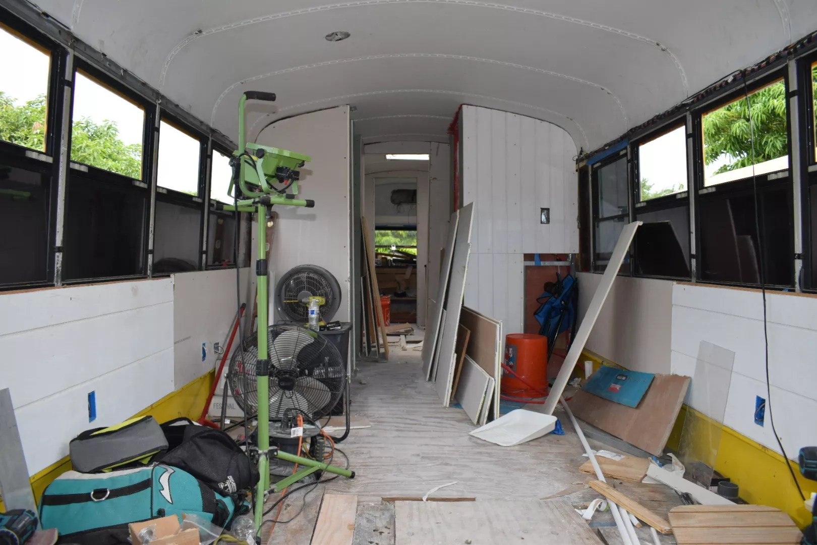 The bus is functional, but the interior remains littered with tools, raw materials, and water bottles.