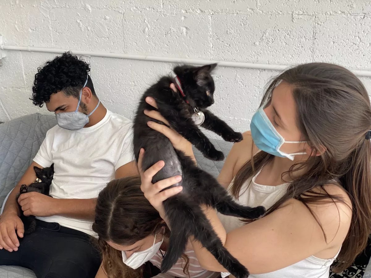 A group of masked teens sits on the couch in the cat lounge, each relaxing with a small kitten. Ashley Dejeu, 19, says she persuaded her boyfriend and her best friend to attend the grand opening with her after she learned about the Cat’s Meow online.