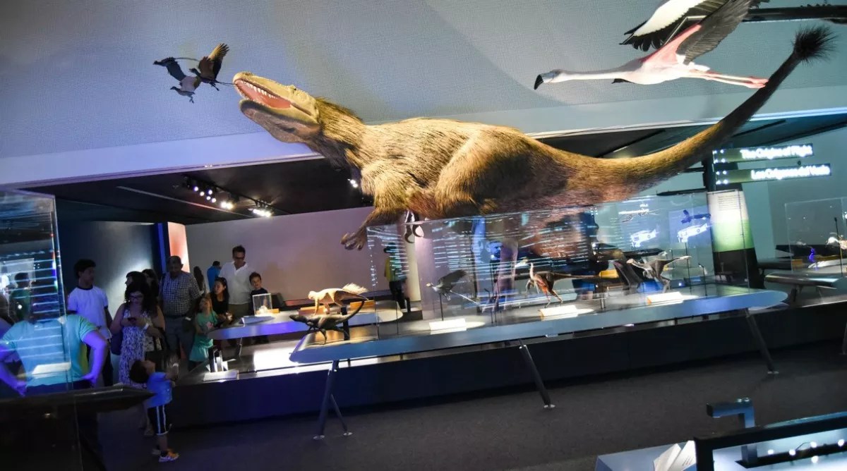 Children gape at Frost Science’s yutyrannosaur in the “Feathers to the Stars” exhibit, which chronicles how birds inspired humans to reach into the sky.