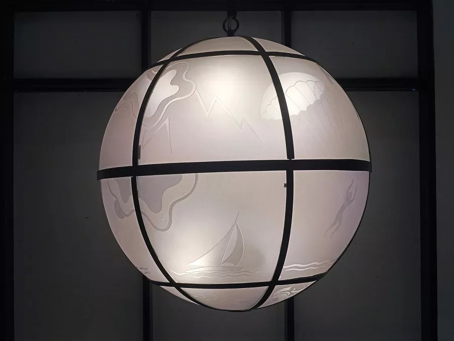 A chandelier (1937) by architect Kjell Westin for a restaurant in Stockholm, Sweden, has transportation images etched in glass.