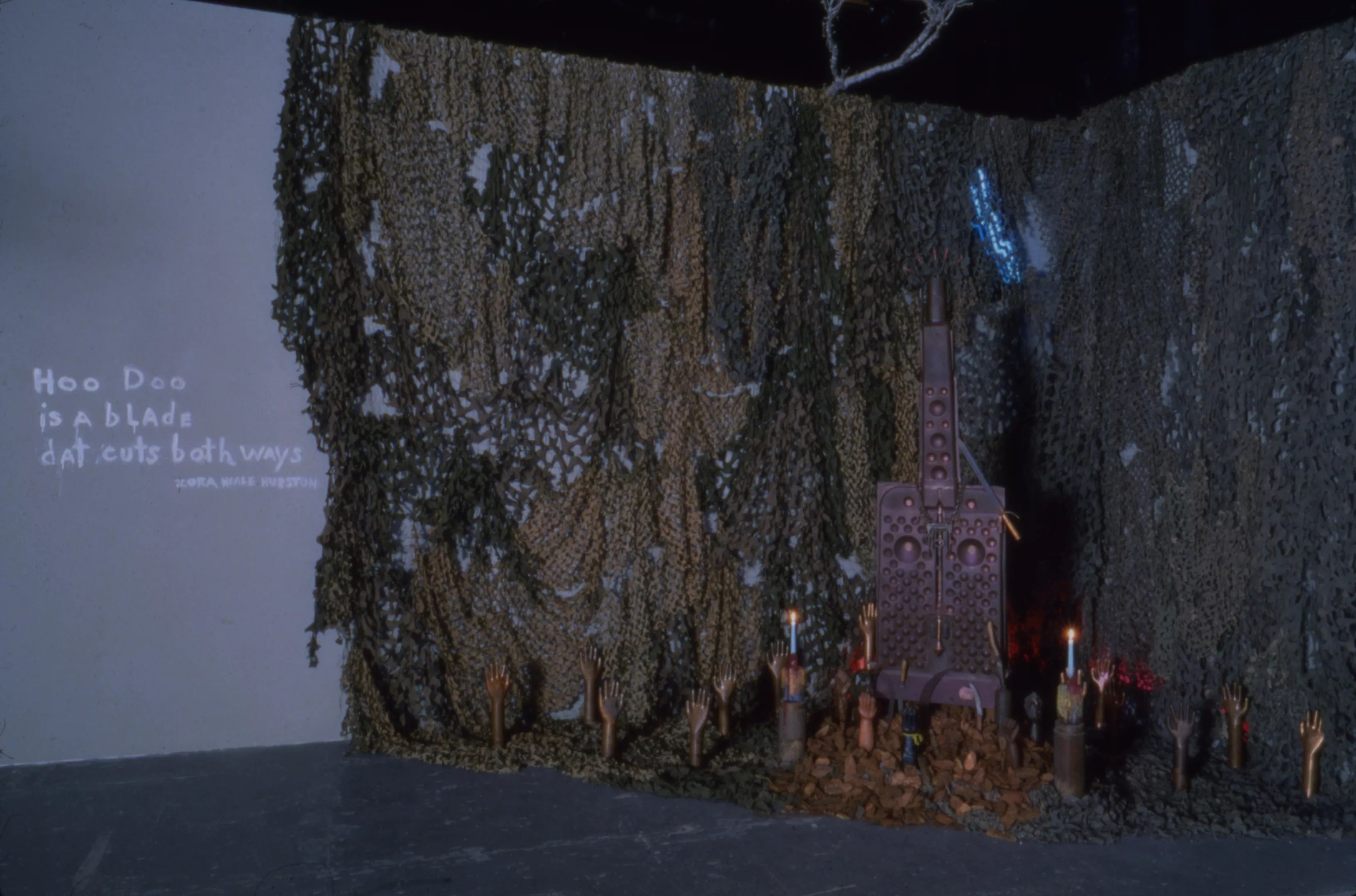 “I collected metaphysical objects, altars, and items related to ancestral history,” Saar writes in an email, adding that she was heavily influenced by a 1975 article by Arnold Rubin, in which he describes the power certain materials have on a piece. “Rubin described how the borders around a rug are used to protect the inner area. If it is sacred – for instance, a prayer rug – then the inside of the design is the sacred part, and the fringe is there to prevent negativity from entering that inner area. I found that very interesting.