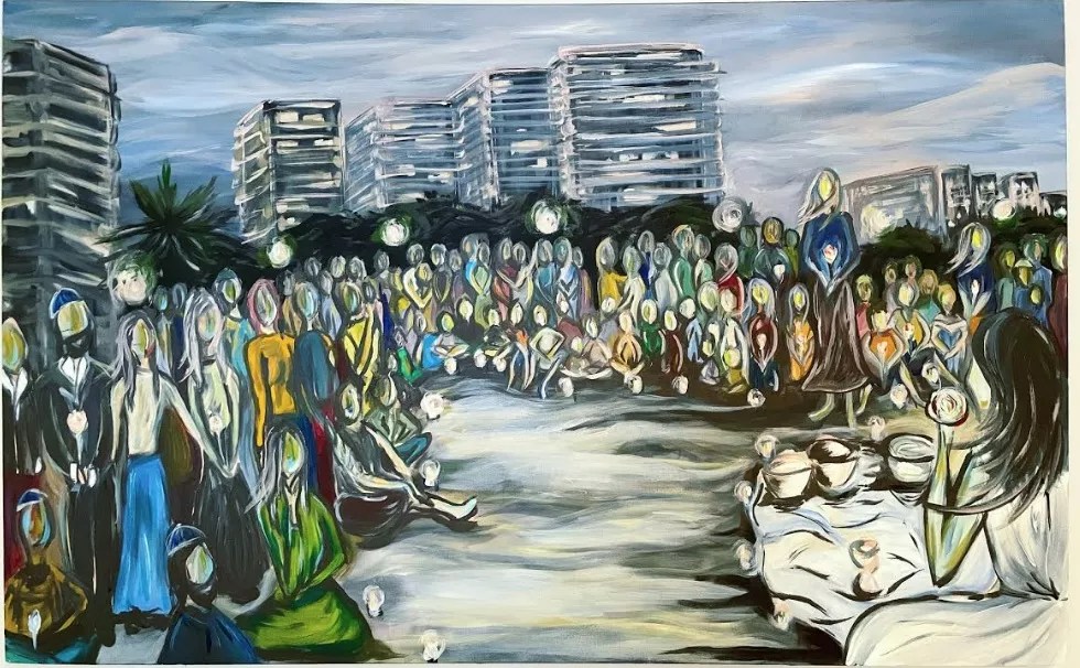 Resembling spirits themselves, intimately side-by-side figures in McLean Fletcher’s painting depict a prayer vigil soon after the collapse.