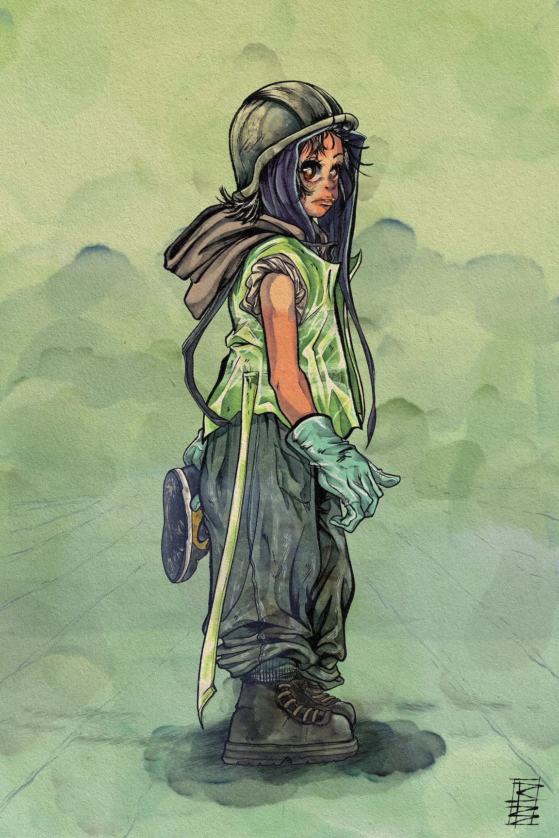 Other artists acknowledge first responders. In her gouache illustration on a digital print background, Ruth Burotte portrays a wide-eyed young woman in hard hat and boots. Eddie Arroyo, painting from a photograph taken by Sanchez, renders green-uniformed responders viewed from behind as they walk toward their shift at the site. Their no-nonsense professionalism is clear; their facial expressions must be imagined.
