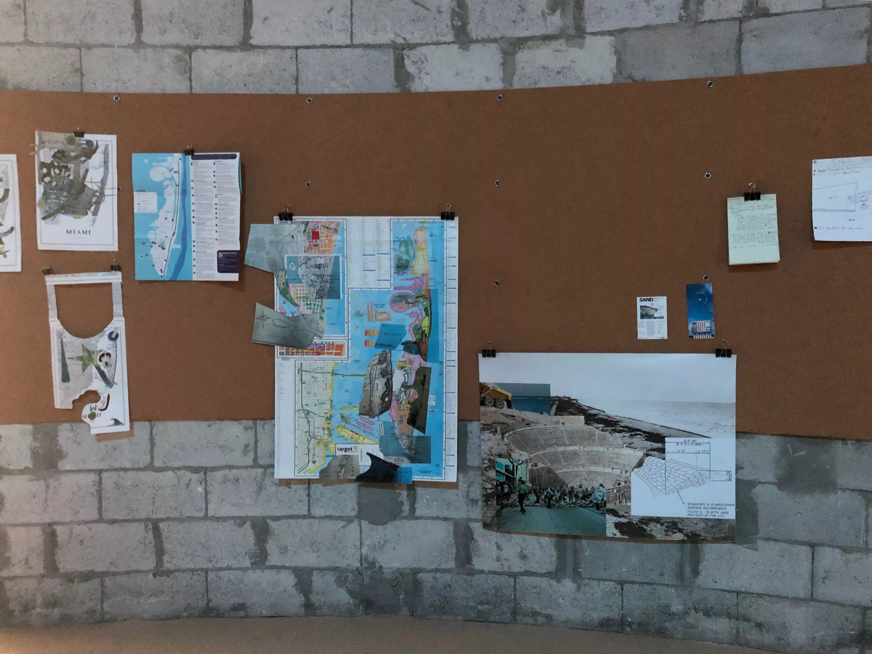 Designed to resemble the interior of a government office – complete with a large round meeting table and chairs, a bulletin board, and a water cooler with cups – the idea for the space came to Soto after the artist began working in the city manager’s office with the Environment and Sustainability Department last summer. As the Art in Public Life resident, through a partnership between Oolite Arts and the City of Miami Beach, Soto has been researching the climate crisis and sea-level rise, learning more about Miami’s municipal government by working closely with its officials, and creating public art projects such as last fall’s Sand: Amphitheater, Theater, Arena.