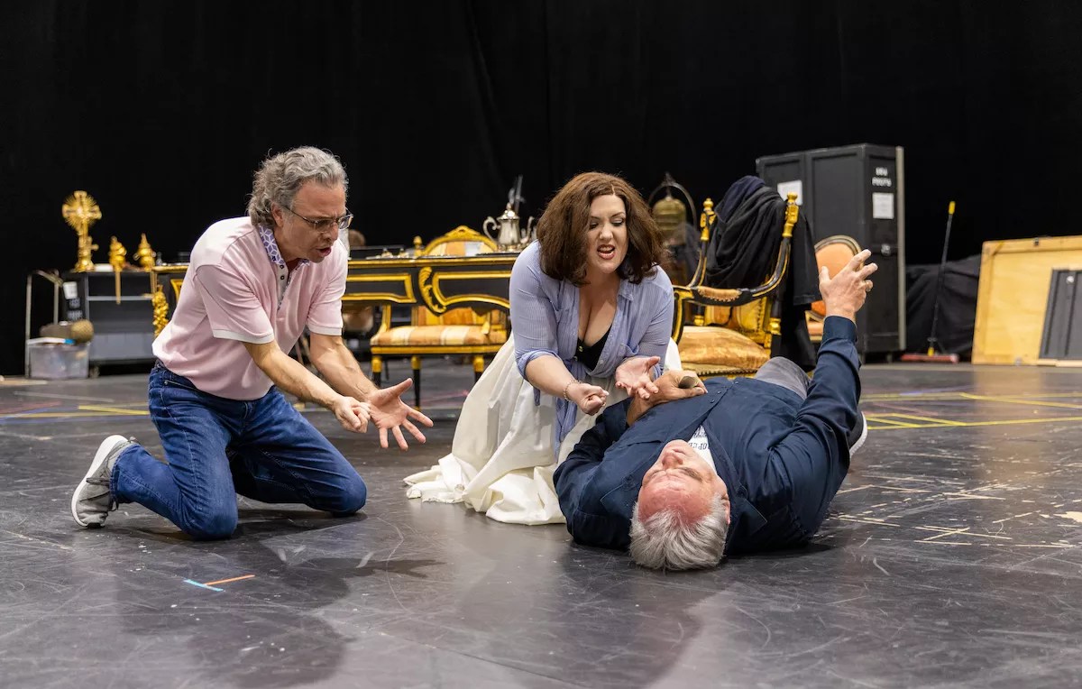 Director Jeffrey Marc Buchman in rehearsal for a scene in Act II of Tosca with Toni Marie Palmertree and Todd Thomas.