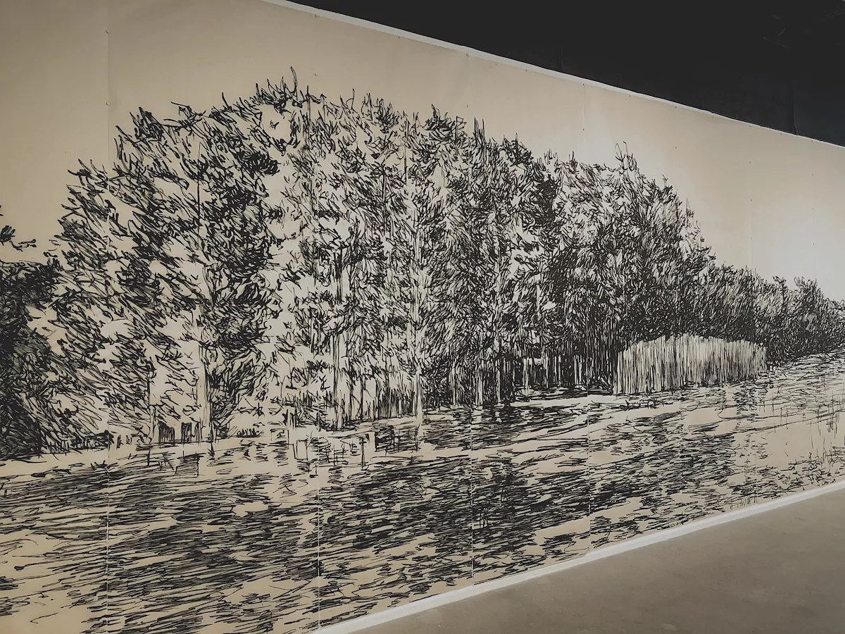 Jennifer Basile’s Cypress Dome (2022) is the largest work in the exhibition, covering an entire wall of the gallery.