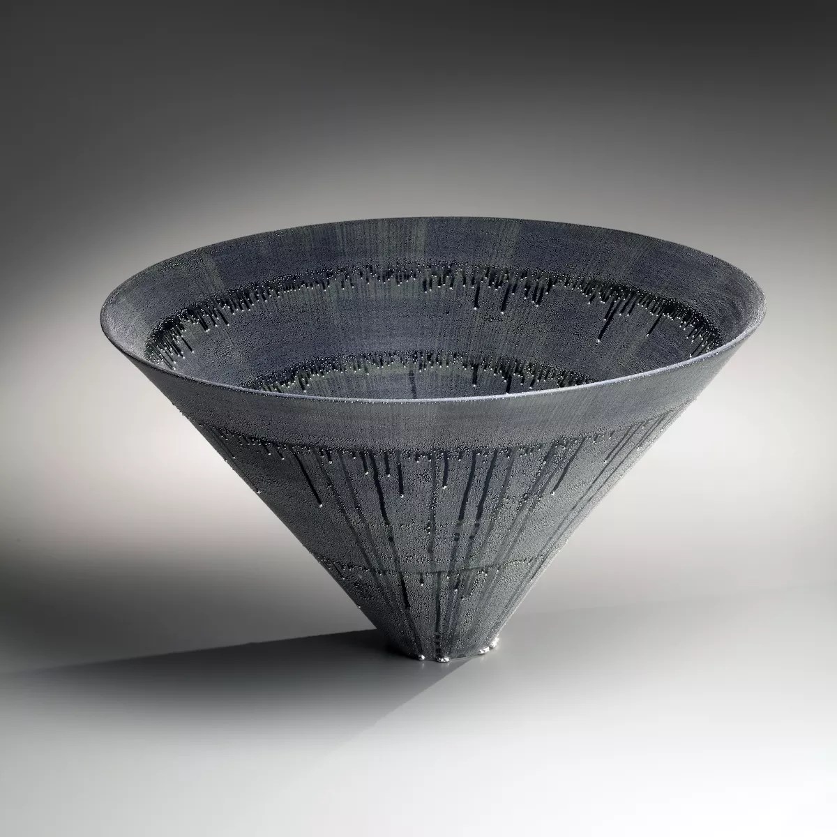 Then came Takahiro. Yuzo’s grandson had never intended to join the family business; his original career path was table tennis, another discipline requiring quick reaction time. However, Yutaka’s early death in 1983 changed things, and Takahiro adopted his uncle’s iconoclasm. First, he experimented with metal glaze, resulting in an iconic, patented technique called ginteki (silver mist), where tiny beads of metal form on the exterior of a piece of porcelain. Utterly dazzling, with some ginteki patterns resembling galaxies or pearls, these pieces feel especially appropriate for glitzy Miami; they also run contrary to the earthy imperfection that traditionally marks Japanese pottery.