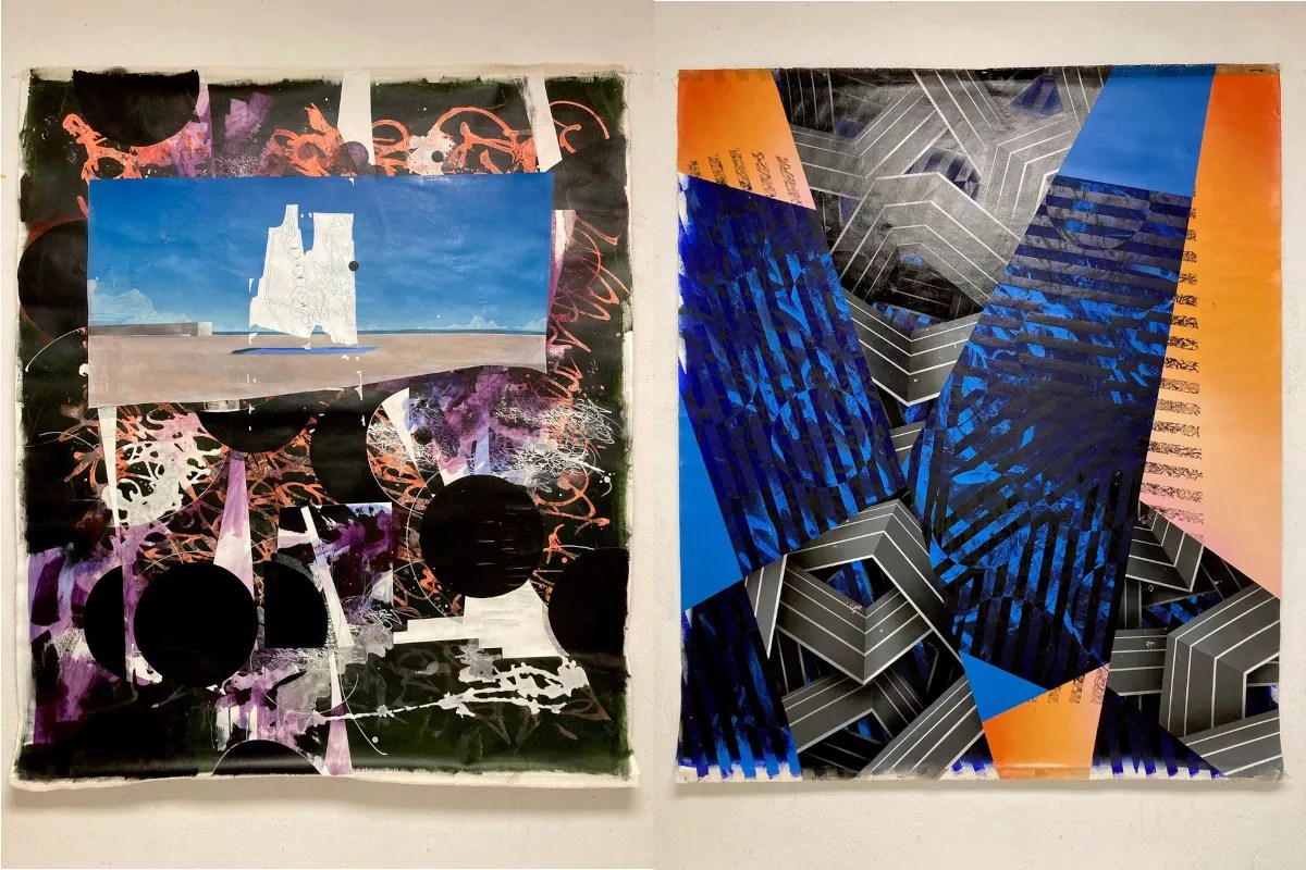 “The whole thing started quite spontaneously through a joint painting session where we painted a canvas together one evening. At the end of the evening, we were both very happy with the work, and we noticed that we had talked the whole evening but not a single word about what we actually just painted,” Hundertmark says. “As it is when something is fun and works well, we have repeated this a few times. We paint mostly temporally on a common image without agreement. Again and again, we partially paint over until we are both satisfied with the result. We have found that this way of working always takes us far out of our own comfort zones, and in a certain way, we are led to a new level that has now also inspired our respective solo works.”