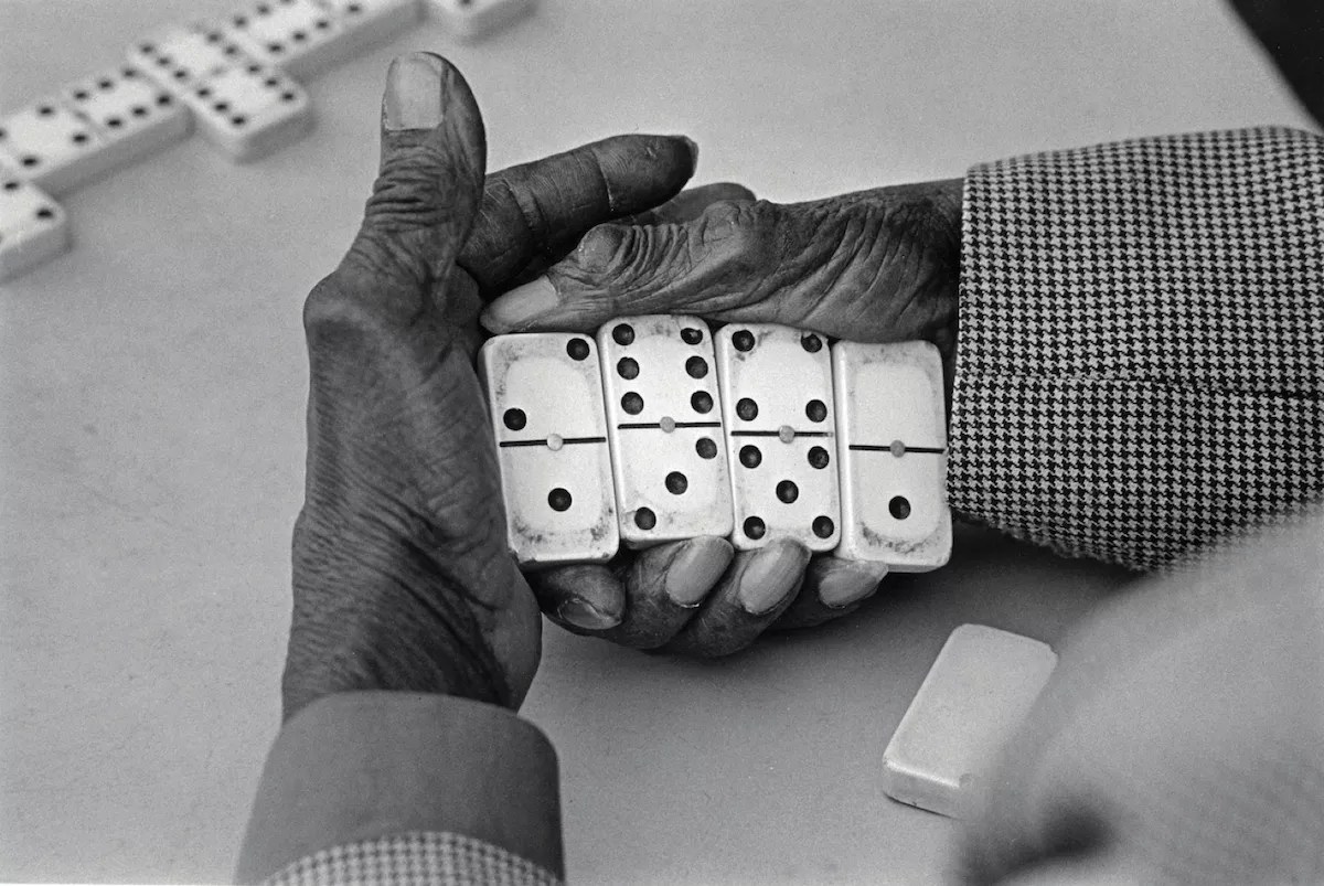 It’s Barrat’s tremendous respect for her subjects that allows them and the settings in which she captured them to be timeless. A photograph taken in Harlem, Eric Williams, the dominoes champion, depicts the hands of a Black man holding four dominoes, connecting the viewer to the characters who inhabit Máximo Gómez Park, the modest Little Havana domino park that represents decades of cultural tradition.