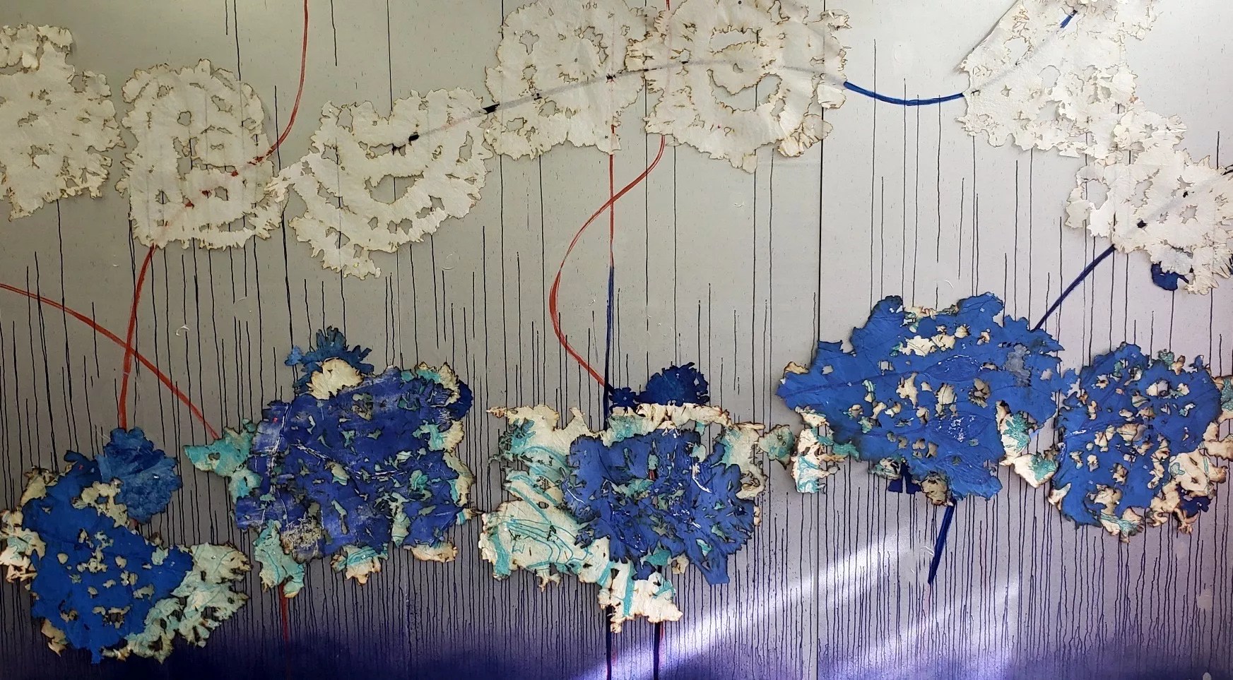 Nowadays, Lehr’s mind is mostly on the primary subject of her art – the environment. She says she’s thinking of converting her swimming pool into a seahorse sanctuary to help local populations recover from habitat loss. She also points out that one of the ironies of using resin is its potential for environmental harm. Synthetic polymer resin can be highly toxic, and though Lehr is careful to source a safer, albeit more expensive, form of resin for her work, she would prefer to find an alternative. Two of her newest works on display – a pair of triptychs that resemble Japanese painted screens – eschew the material.
