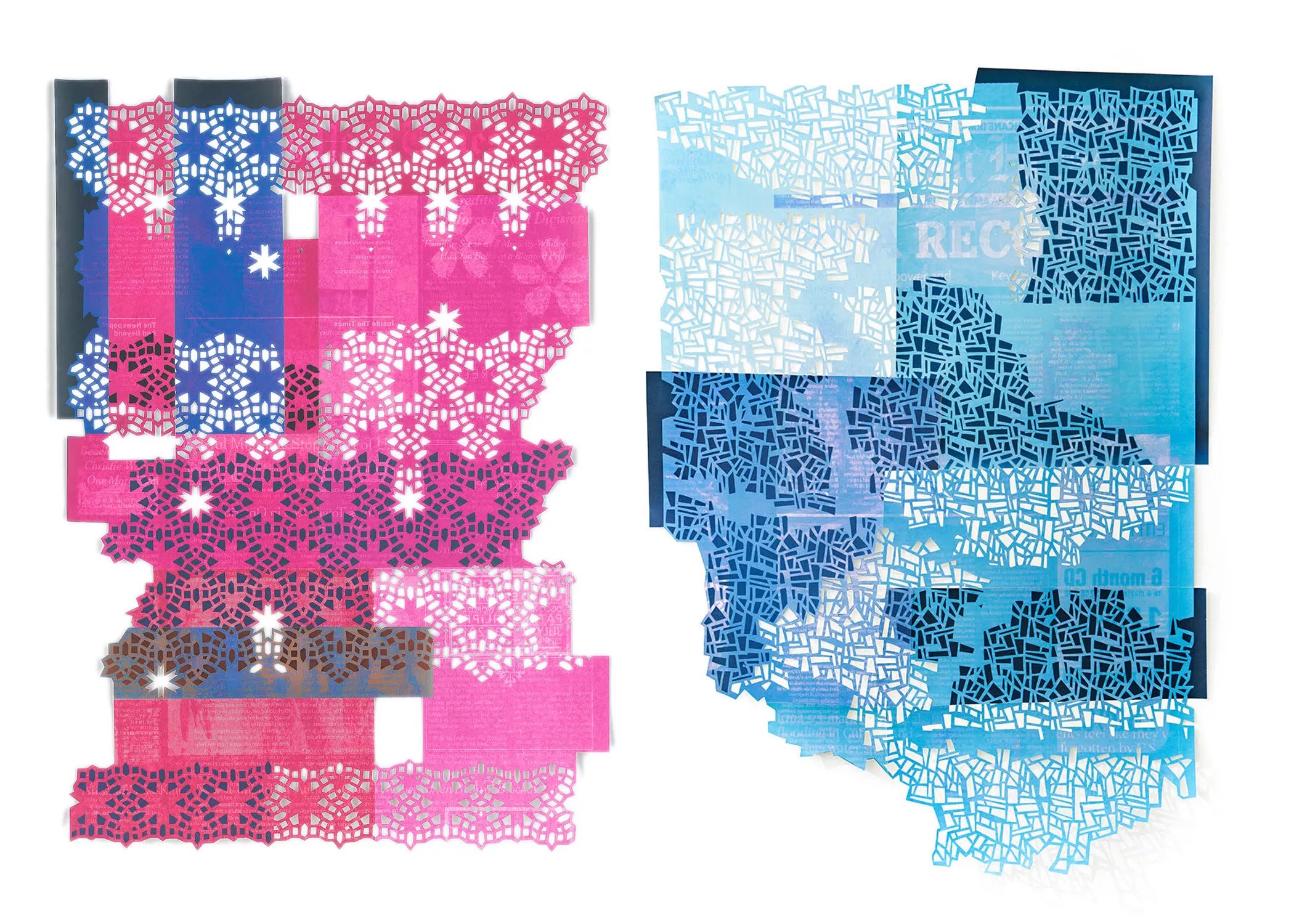 Donna Ruff, Division, 2018, archival print on kozo paper from photogram, 31.5 x 23.5 inches; and After Irma, 2017, archival print on kozo paper from photogram, 38.5 x 27 inches