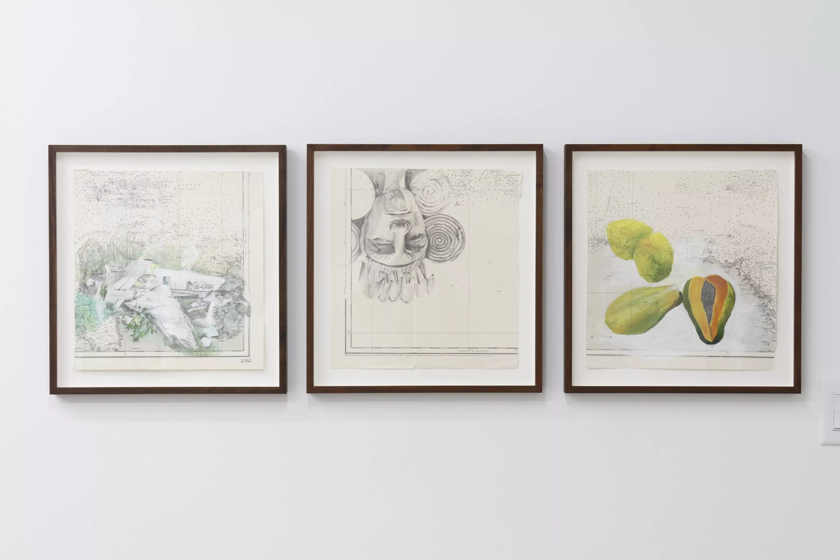 Using CAD prints he found while exploring an abandoned hotel on the island of Contadora in Panama, the multigenre installation employs sculpture, drawings, and video to tell a story of maritime strife in the postcolonial Americas using islands, or rather the concept of islands, as an anchoring structure for ideas. The pieces were inspired by and utilize the found objects with the main sculpture, a creation dictated by the blueprint of the CAD prints.