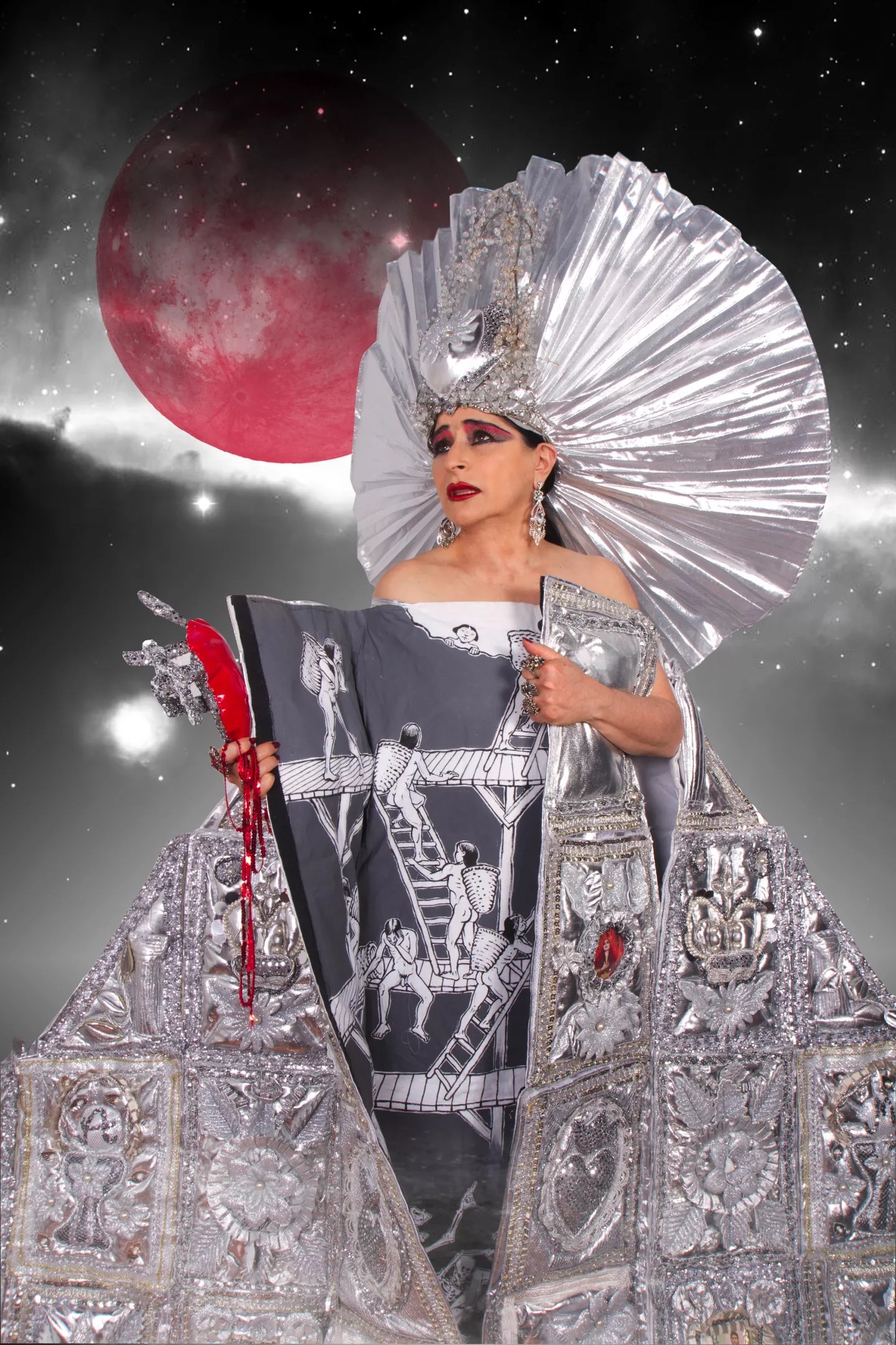 Mexican singer, actress and performance artist Astrid Hadad takes the absurd seriously. Her surreal brand of cabaret lampoons the marketing of Mexico’s cultural icons and reframes received historical truths. Her costumes, often marvels of movable set design, unfold, billow and blink. At one moment, she’s a living Diego Rivera calla lilies painting, and the next, a walking Aztec pyramid. She can turn herself into an altar, a revolver-shooting mama and a Frida Kahlo trinket.