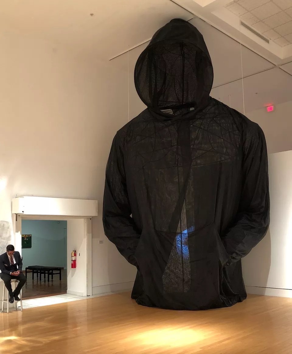 “A House Divided” is the latest of artist and University of Miami instructor Billie Grace Lynn’s probing explorations of social conflict. Using her students as subjects, models, and informants, she has created a multilayered, audience-participatory project that addresses the raw issues of race-based inequality, discrimination, and disrespect. It comprises an online forum; a three-hour video of intimate testimonials; a teetering reflective obelisk; and an adjacent, 22-foot-tall, hollow, veil-like “hoodie” sculpture, suspended from the ceiling, that visitors can enter for another kind of reflection.