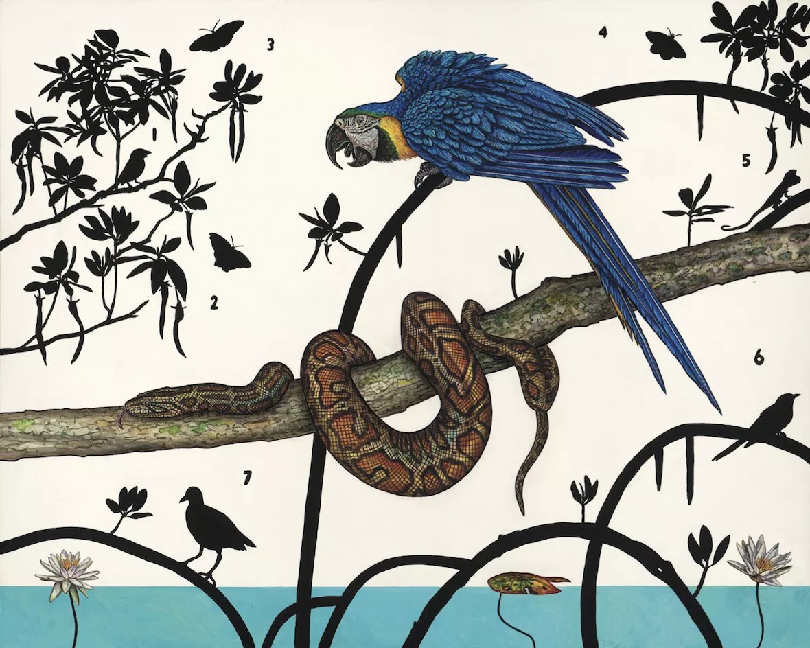 His Audubon-worthy, watercolor of a blue-and-yellow macaw includes a red mangrove branch and a morning glory flower. Prosek reprises the macaw for a larger painting, where he adds a similarly realistic Burmese python, but again juxtaposes black silhouetted butterflies, birds, plants and numerals. The mix of stylistic representations introduces an unsettling conceptual twist, contributing to what makes Prosek a contemporary artist.