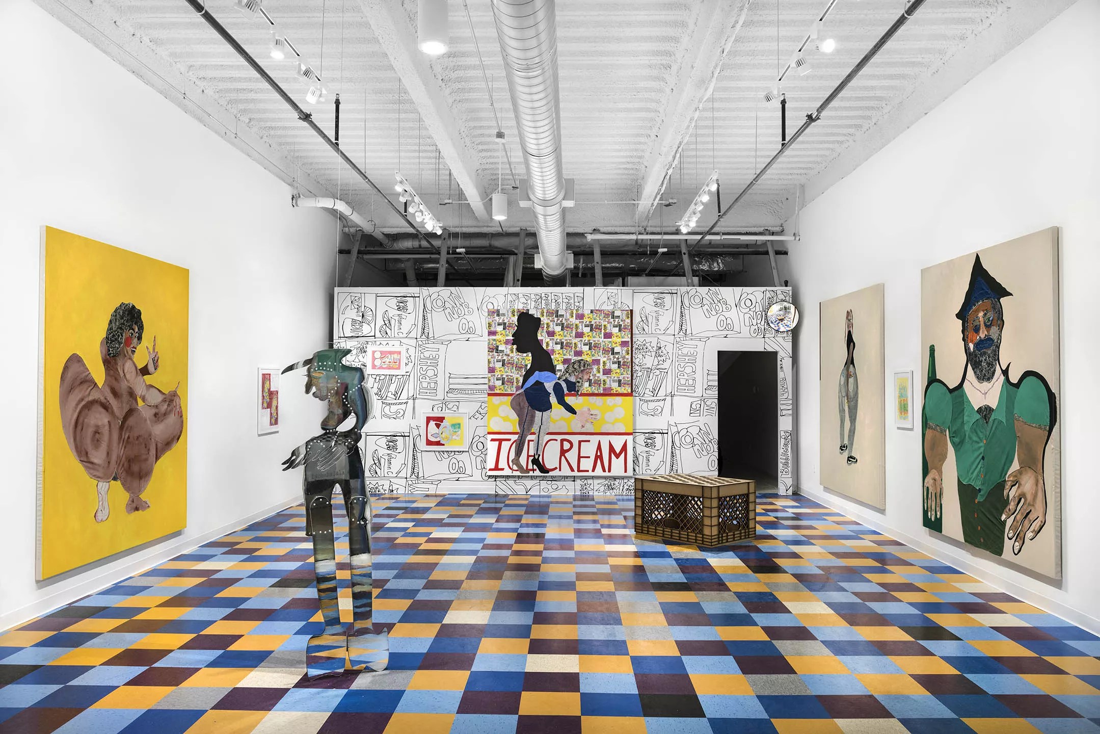 In her exhibition at Thierry Goldberg, Self re-creates those same corner shops and ethnic markets that pepper her hometown. The gallery space is even adorned with neon signs and multicolored checkerboard flooring, reflecting a bodega’s festive vibe.